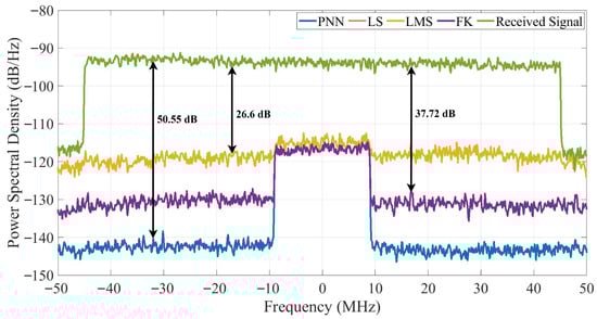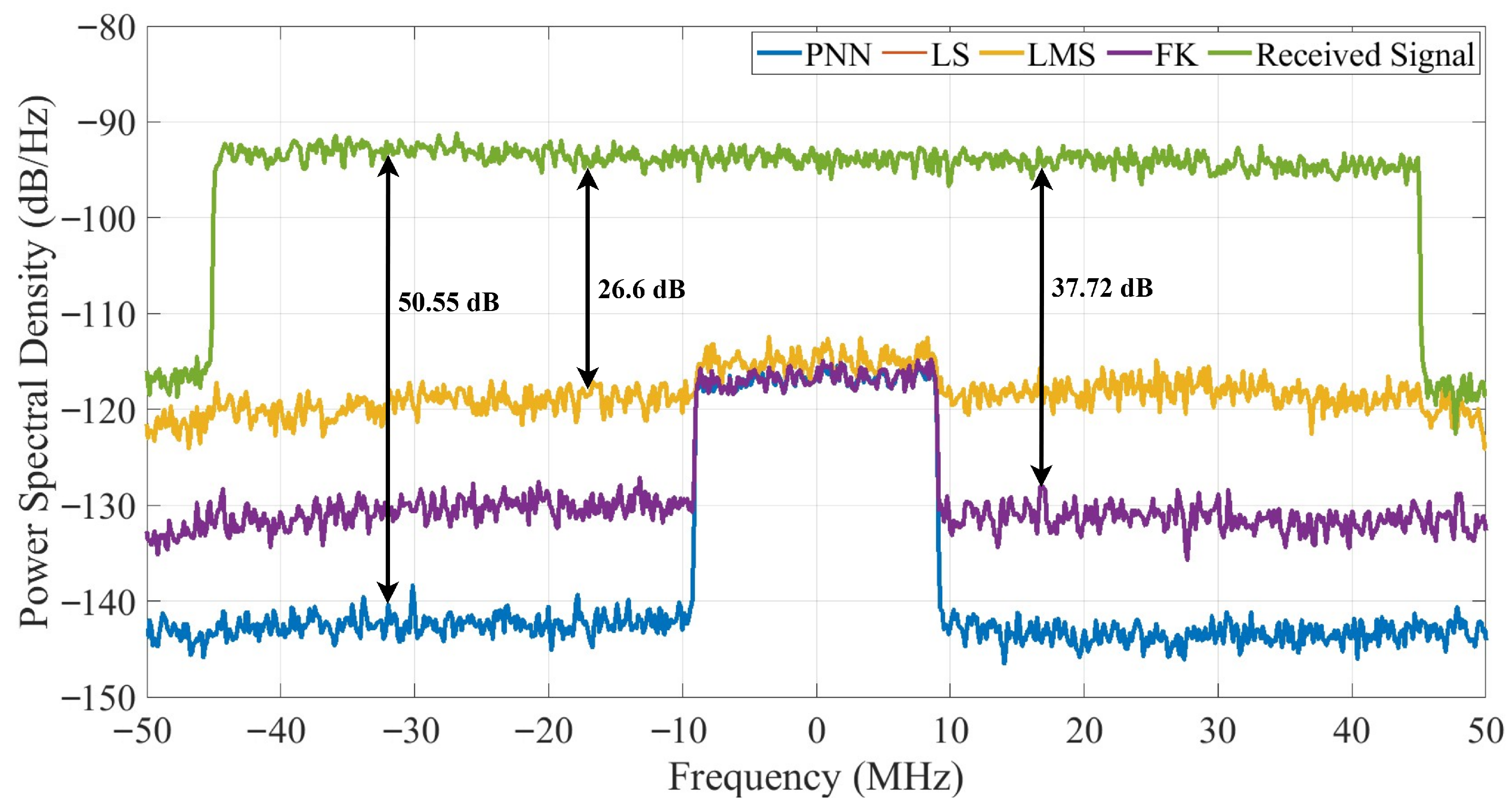 Figure 12 shows the power spectral density (PSD) of the received and residual SI signals after digital cancellation, assuming that the propagation and analog domains have already provided initial suppression. The obtained residual SI suppression levels are approximately 50.55 dB for PNN, 37.72 dB for FK and LS, which exhibit nearly identical performance, and 26.6 dB for LMS, when SIR = −30 dB and SNR = 30 dB, indicating that the proposed PNN achieves the most effective nonlinear cancellation. These results confirm that, once the analog and propagation domains have reduced the SI to manageable levels, digital-domain cancellation can further suppress the remaining components and achieve near-complete mitigation in IBFD systems.