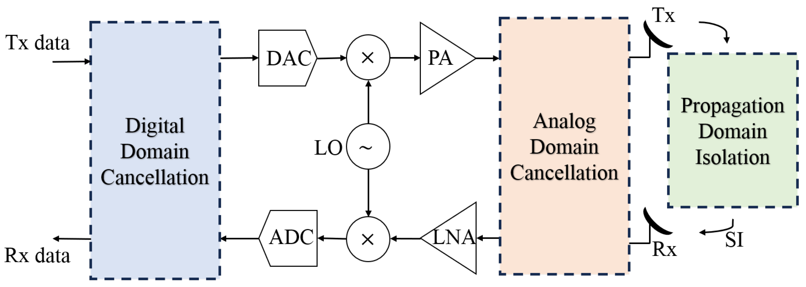 However, a portion of the transmitted signal inevitably couples back into the receiver via antenna reflections, multipath propagation, or direct leakage, appearing as SI that can be suppressed in three different domains, as mentioned in