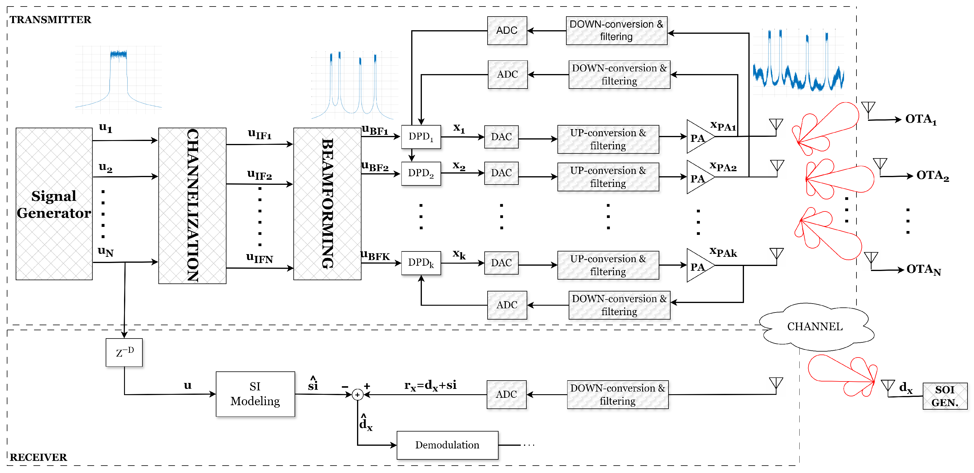 10]. Given these limitations, the focus is thus directed toward additionally canceling the SI in the digital domain, which serves as the final cancellation stage to suppress the residual SI that persists after propagation and analog suppression. This stage is essential for modeling hardware-induced nonlinearities and supporting adaptive, software-defined optimization, provided that the propagation and analog cancellation stages sufficiently suppress interference to maintain the receiver ADC’s required dynamic range [