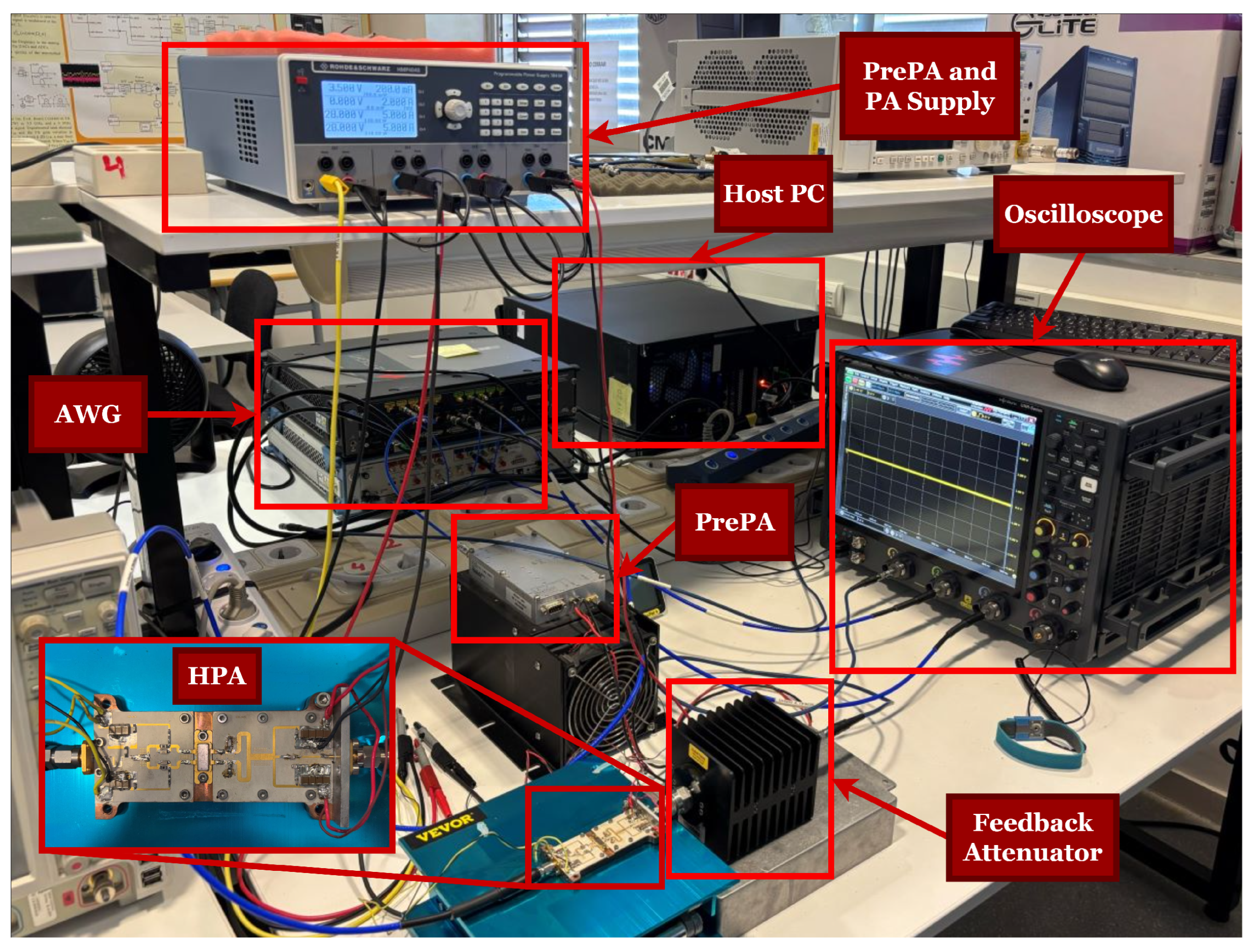 Figure 5 depicts the experimental configuration used for signal generation, transmission, and acquisition. The device under test (DUT) employs a broadband hybrid high-power amplifier (HPA) optimized for L-band applications, with its detailed specifications provided in [