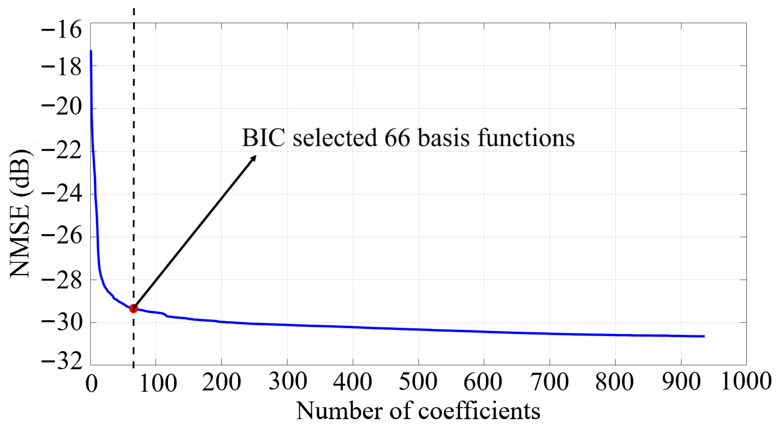 basis functions in the original parameter configuration, the BIC recommends using only the 66 most significant ones. This selection reduces dimensionality by more than 93 % while maintaining modeling accuracy. Consequently, the proposed approach supports an efficient and practical implementation of the SIC system with minimal performance loss.