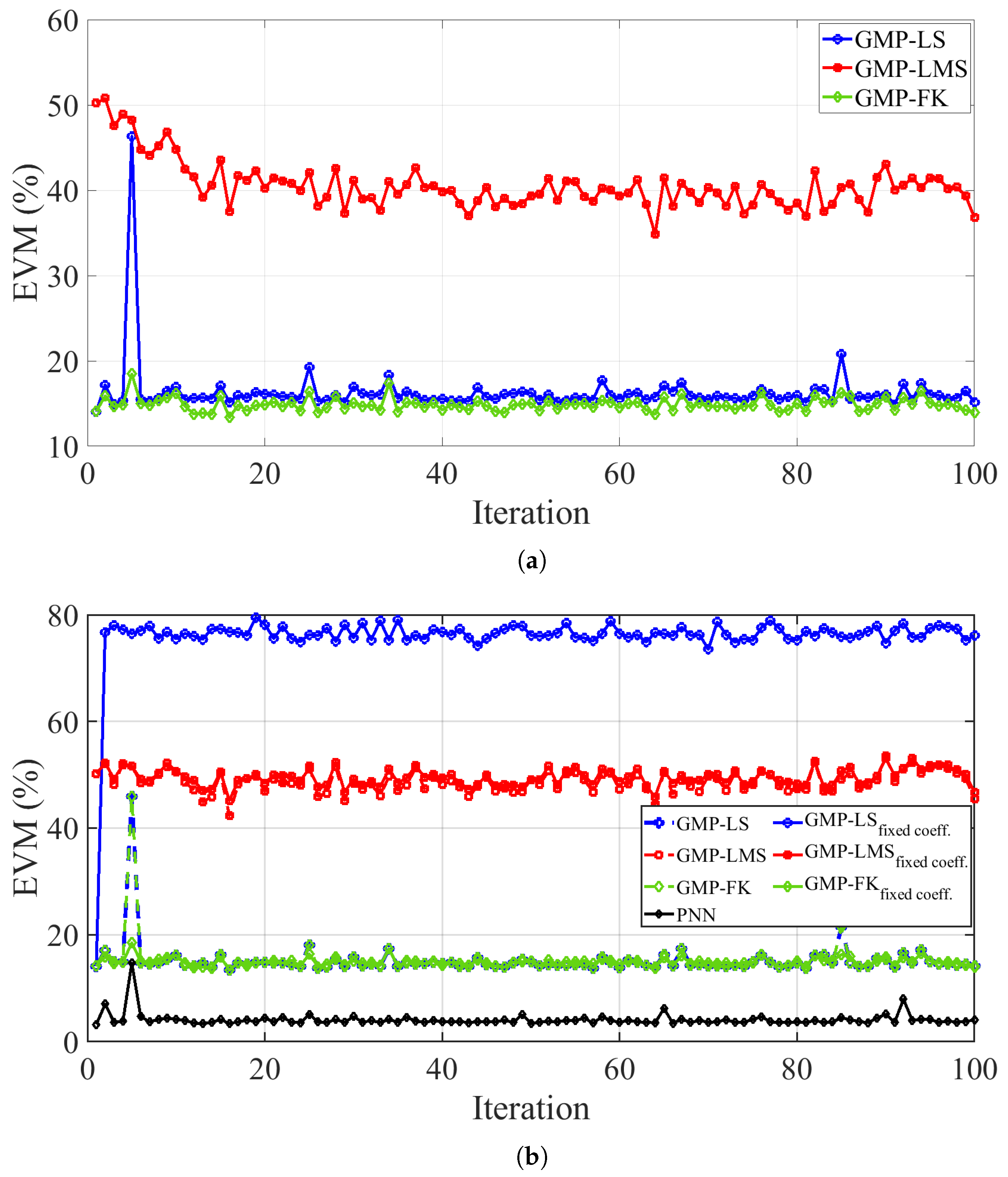 Figure 9a, the GMP model using Itô–Hermite polynomials is considered, with coefficients continuously adapted via LS, LMS, or FK. In contrast,