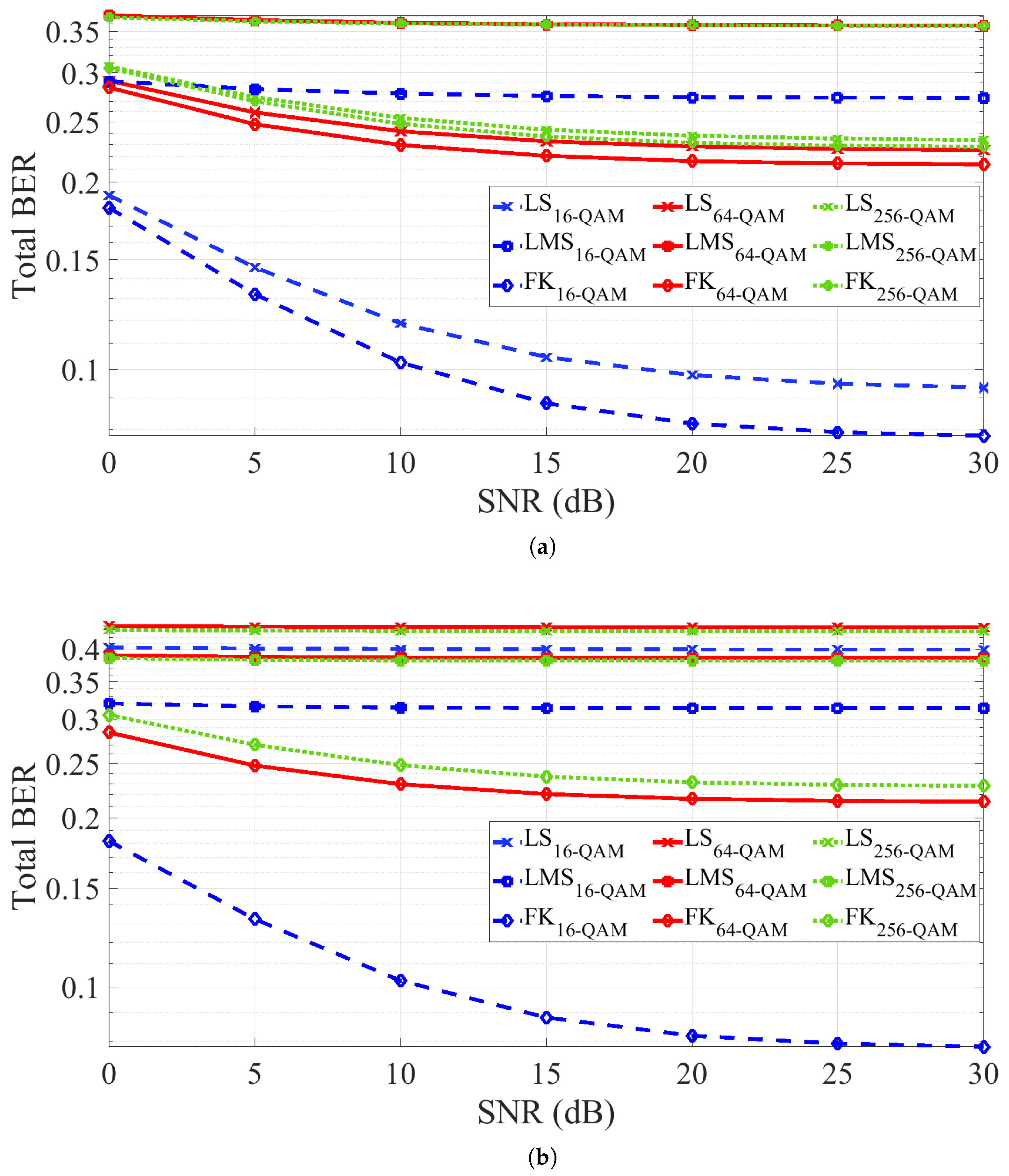 In addition to EVM, which assesses symbol-level accuracy, we evaluate the system’s bit-level performance using the Total BER. This metric offers a comprehensive view of decoding reliability across all iterations, reflecting the overall effectiveness of each SIC method under dynamic signal conditions. The Total BER is calculated as