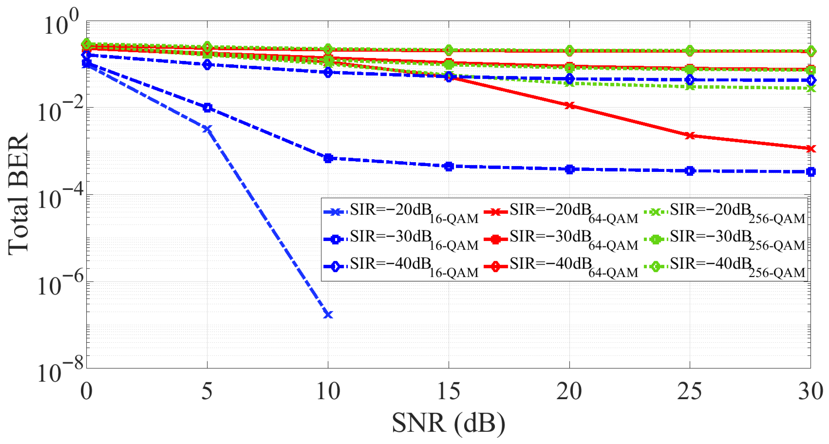 Figure 10, higher-order modulations result in higher BER, while increasing the SIR improves BER. However, also consistent with