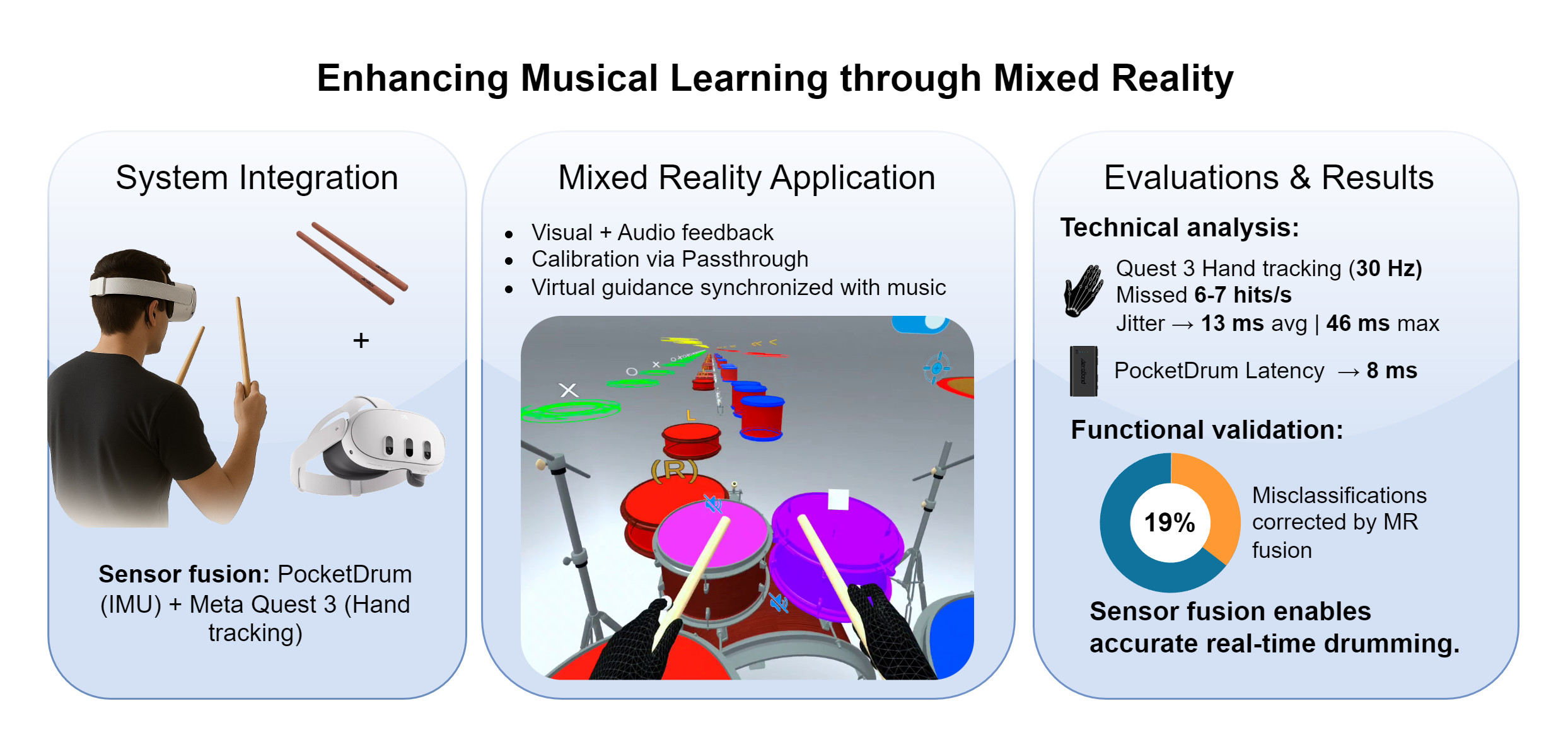 Among these, MR offers a unique opportunity to combine the immersive benefits of virtual environments with the contextual awareness of the real world. This opens the door to new interaction models that preserve key physical cues (e.g., holding drumsticks, foot placement) while enhancing feedback, visualization, and portability. However, creating a realistic and responsive MR drumming experience remains technically challenging due to issues such as input latency, spatial calibration, and sensor precision, especially in the absence of physical contact surfaces. Beyond the technical challenges, drumming also involves complex perceptual–motor learning processes. According to embodied and cognitive models of musical performance, rhythmic skill emerges from the tight coupling between perception, action, and mental imagery [1,2]. In this view, musicians continuously simulate and anticipate the sensory outcomes of their gestures, adjusting movement based on auditory and visual feedback. Preserving tactile interaction and providing synchronized multisensory cues, as achieved in our MR setup, supports this embodied loop of prediction and correction that underlies musical learning.