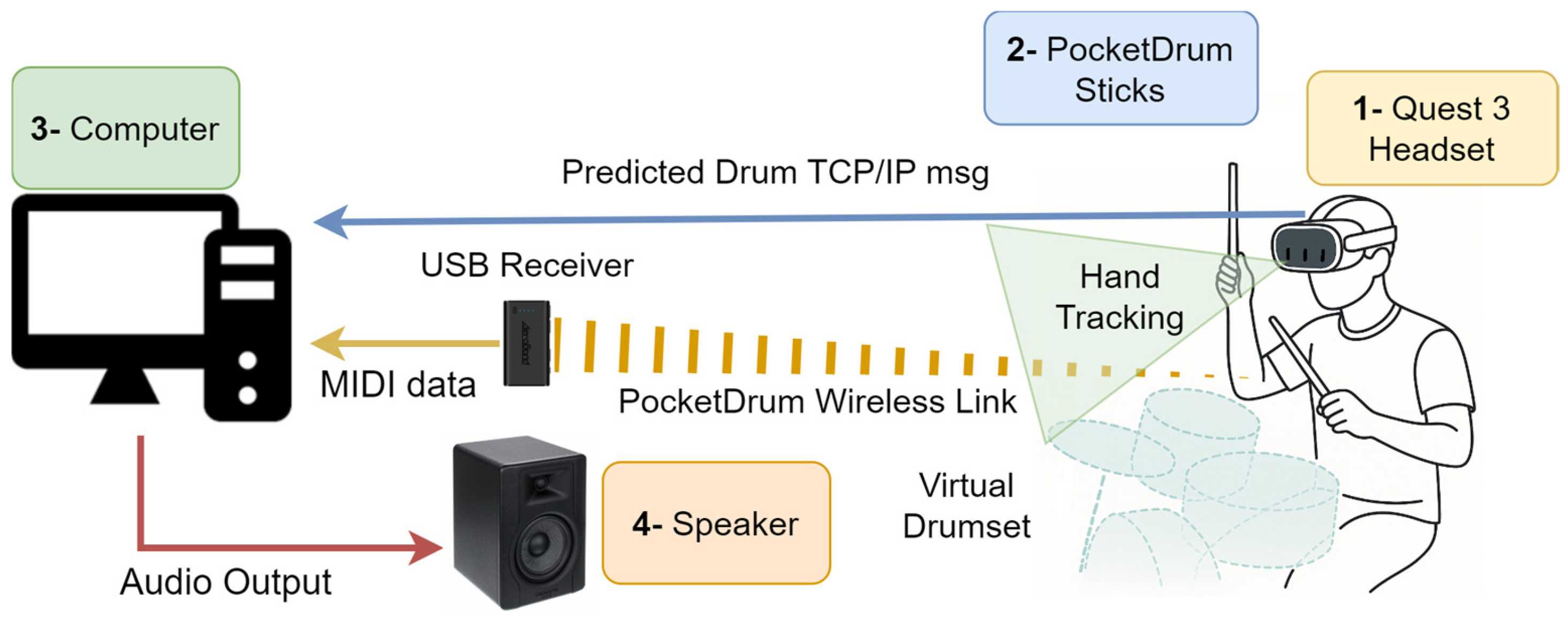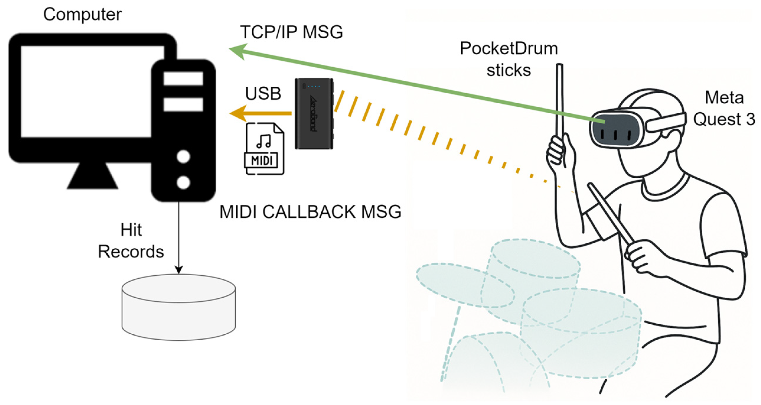 The system consists of four main physical components: the Meta Quest 3 headset (Meta Platforms, Inc., Menlo Park, CA, USA), the PocketDrum drumsticks (Aeroband, Shenzhen, China), a computer, and a high-powered speaker. Figure 2 illustrates the physical layout of these components in the MR drumming setup, showing how they are arranged to support real-time strike detection, sound playback, and synchronized visual feedback. The system integrates two complementary data streams: the PocketDrum drumsticks send strike events in MIDI format to the computer, while the Meta Quest 3 headset continuously transmits hand position data via TCP/IP. Upon receiving a strike, the computer uses both data sources to accurately determine which drum was hit and to generate the corresponding sound in real time. It also sends feedback information to the headset to update the visual scene.