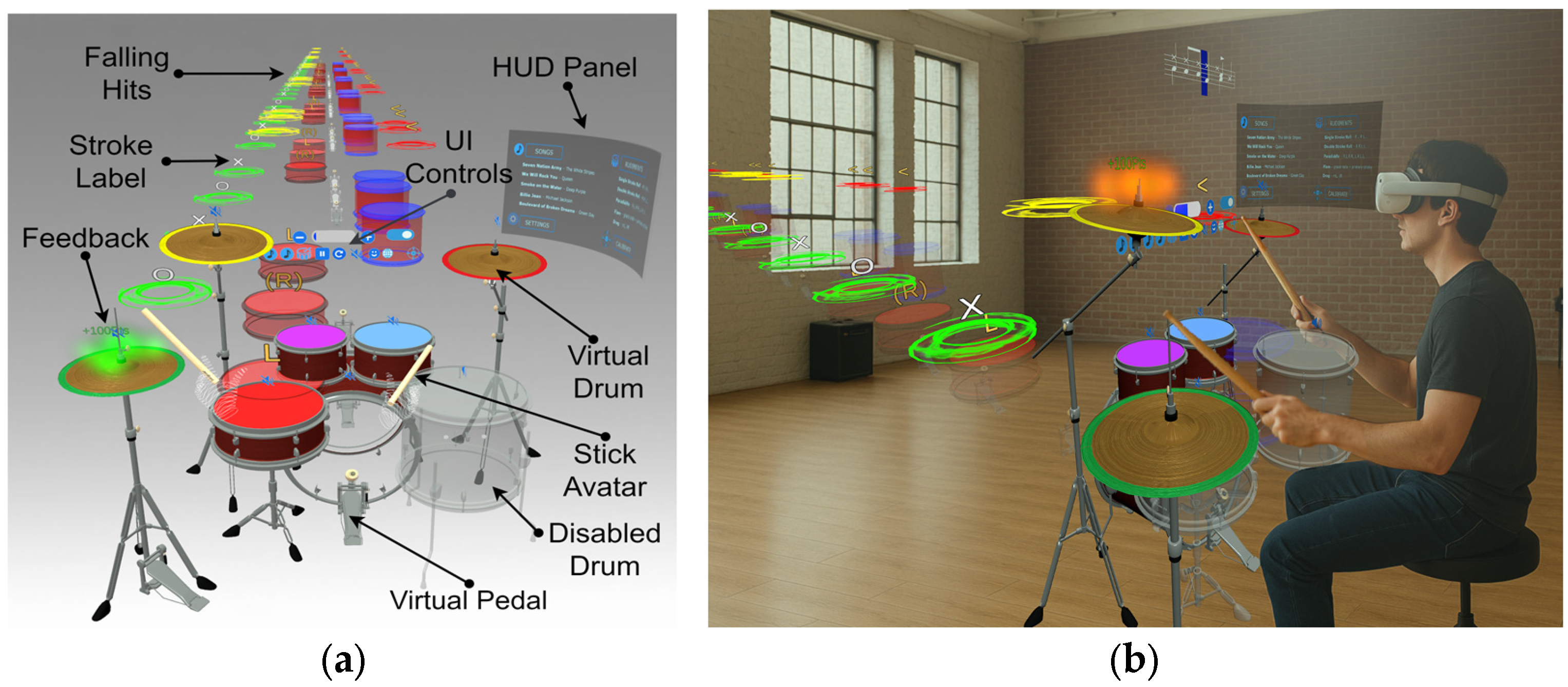 In the field of educational applications, Kweon et al. [3] developed a drum learning system based on augmented reality (AR) and VR, designed to enhance students’ rhythmic accuracy and intuition. Their system provided visual guidance over a real drum set in AR or fully simulated drumming environments in VR. Users received real-time feedback through synchronized visual, auditory, and tactile cues, showcasing the potential of immersive learning for drumming.
