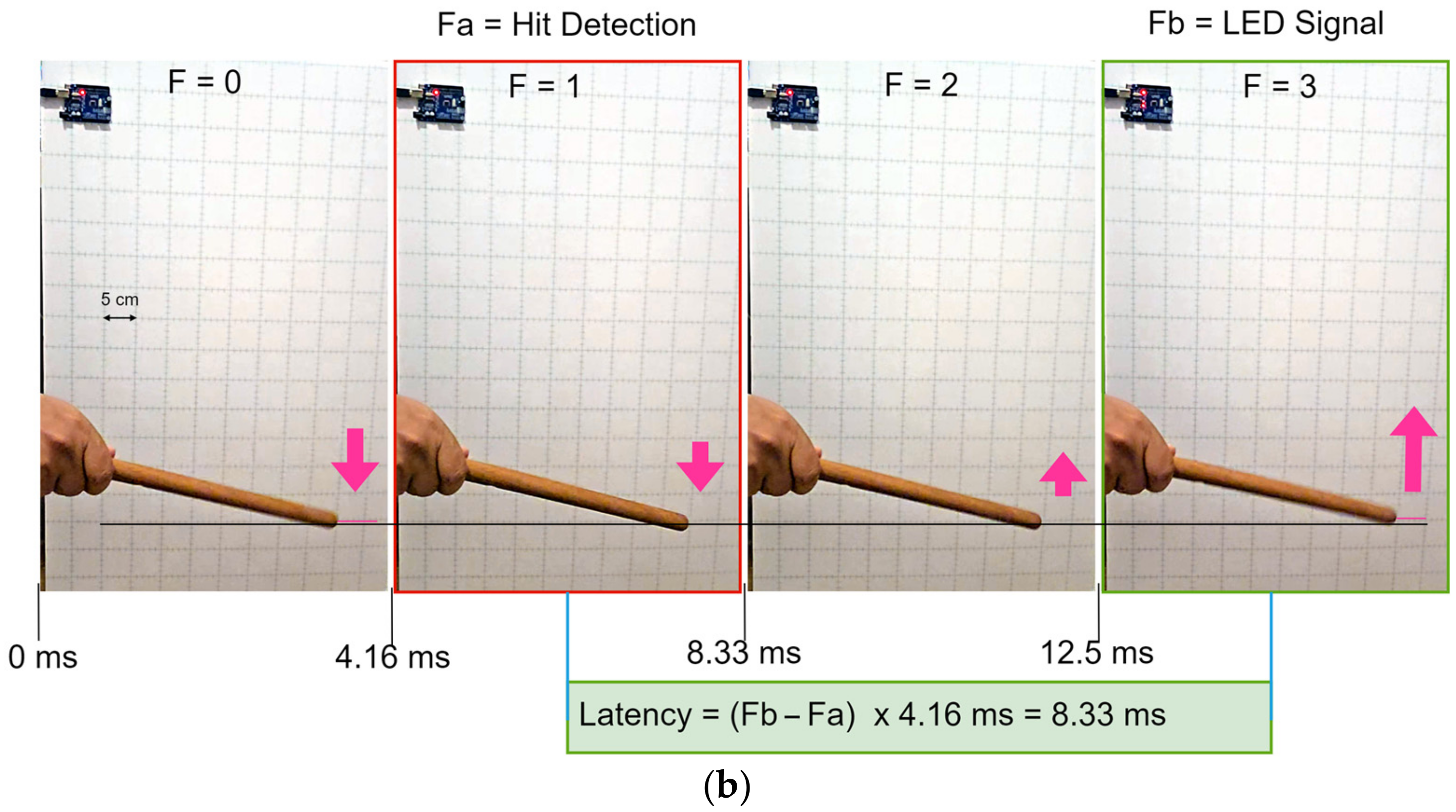 Figure 7. Experimental setup and timing analysis for latency measurement using PocketDrum. (a) Physical setup showing the connection between PocketDrum, the computer, the Arduino UNO board, and the LED used as a visual marker; (b) Frame-by-frame visualization of the stick’s motion and LED activation, used to determine latency between the physical strike and the system’s response.