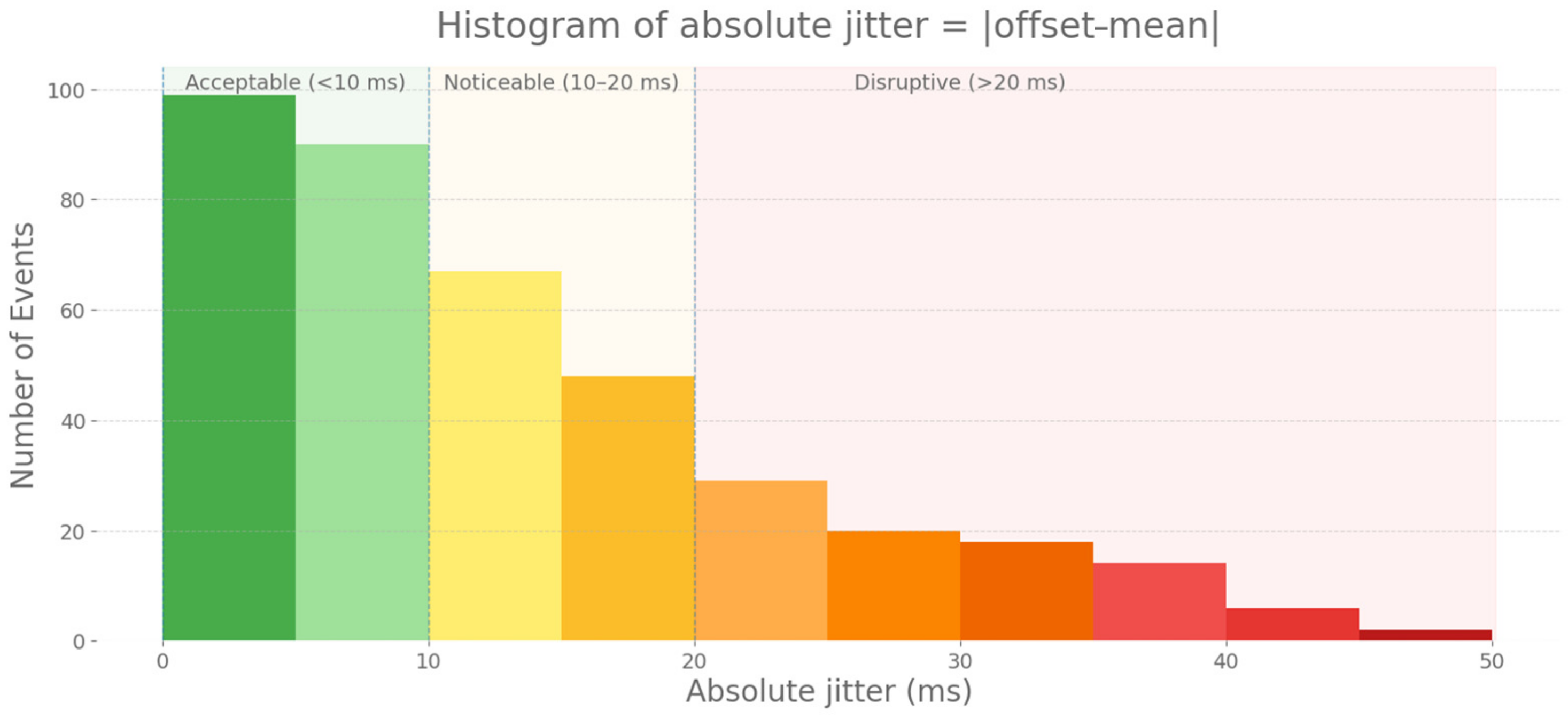 Figure 8. Histogram of absolute jitter (|offset − mean|) across all 393 paired events. Bars are color-coded by perceptual thresholds: green for <10 ms (acceptable), yellow–orange for 10–20 ms (noticeable), and red for >20 ms (disruptive).