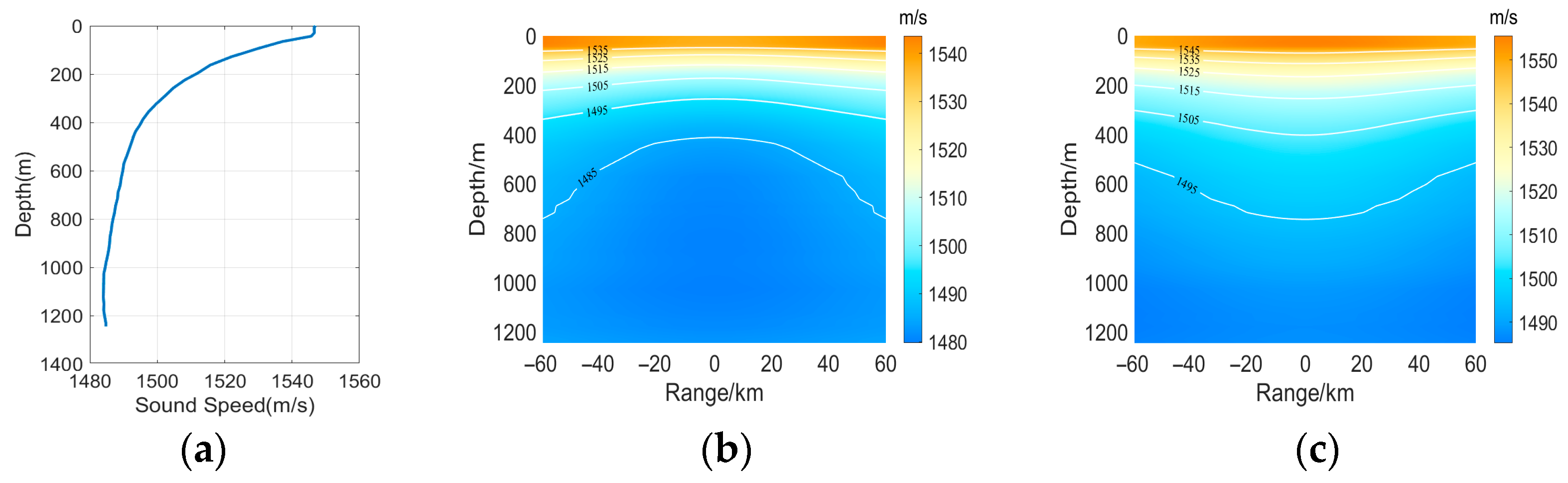 - Tu, H.; Wang, Y.; Zhou, X.; Xu, G.; Gao, D.; Ma, S. Application of a Spectral Scheme for Simulating Slowly Horizontally Varying Three-Dimensional Ocean Acoustic Propagation. Ocean Eng. 2026, 343, 123035. [Google Scholar] [CrossRef]