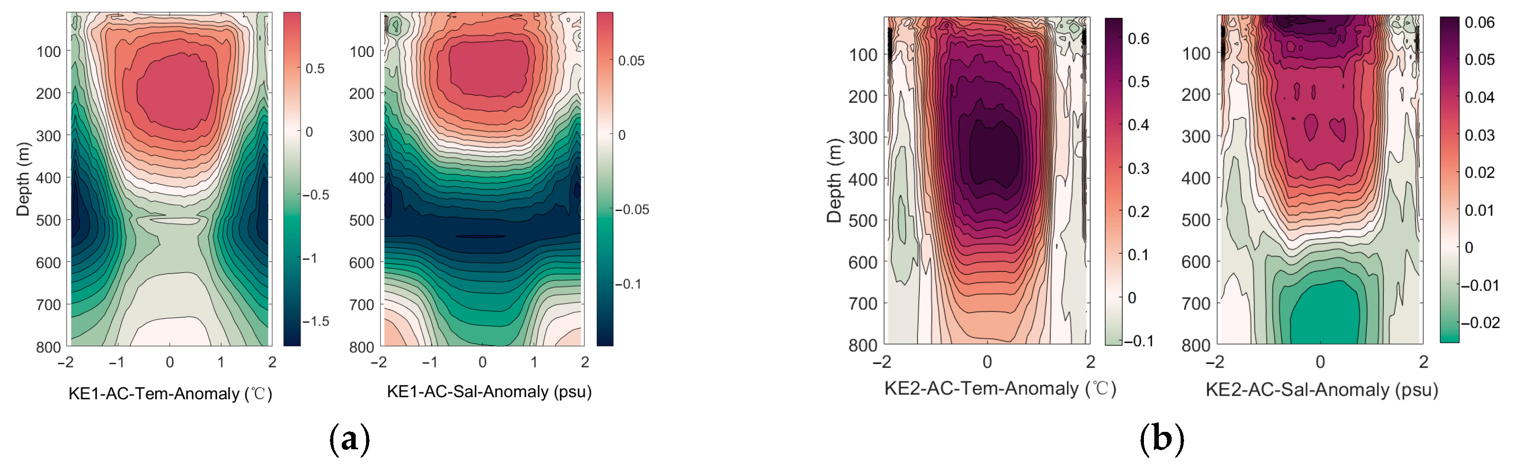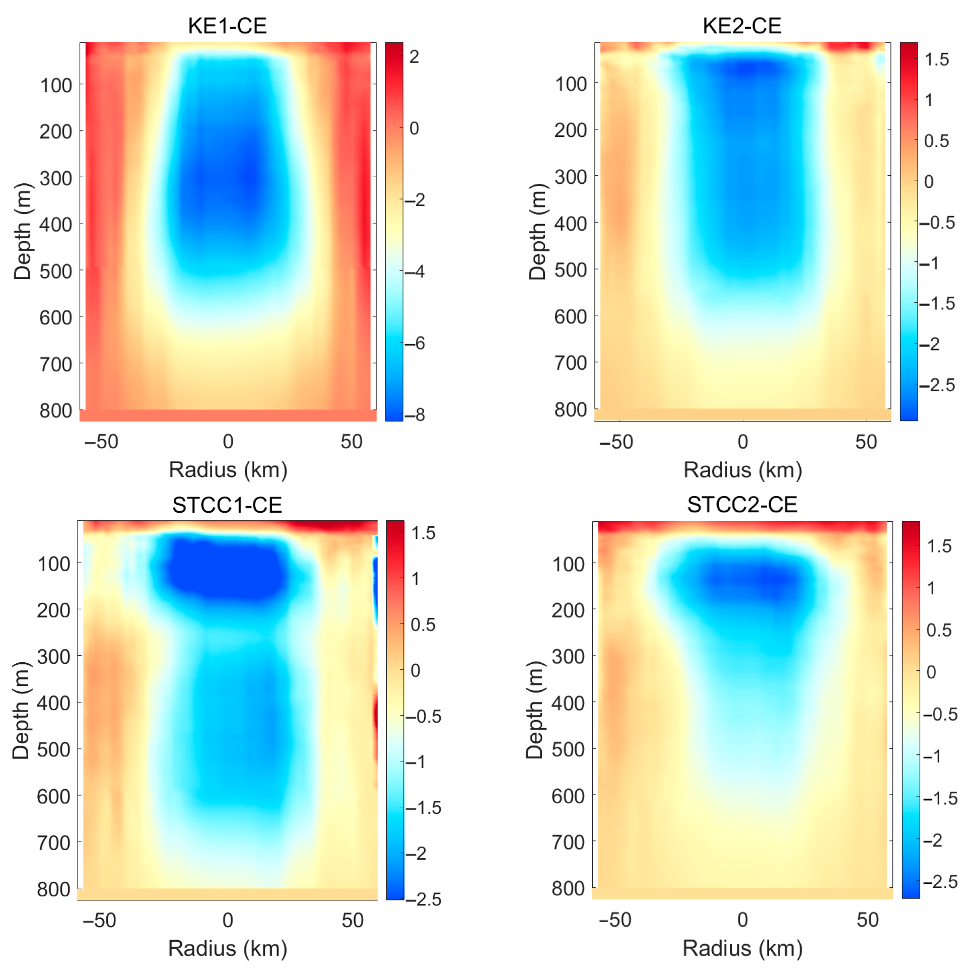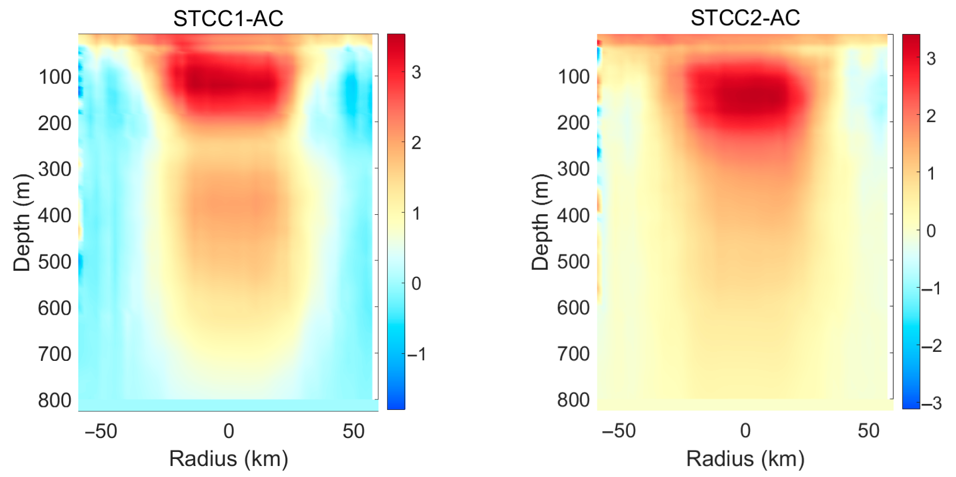 2.2. Composite Analysis of the Vertical Structure of Mesoscale Eddies