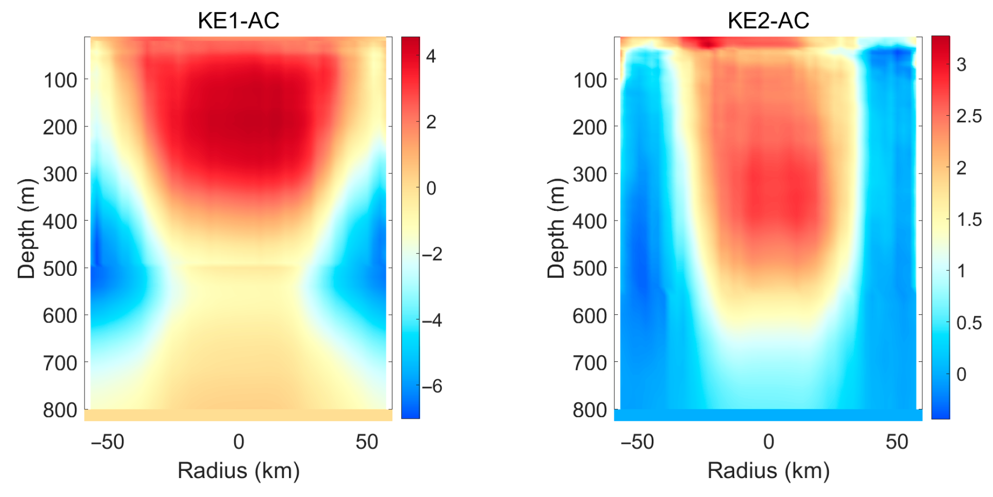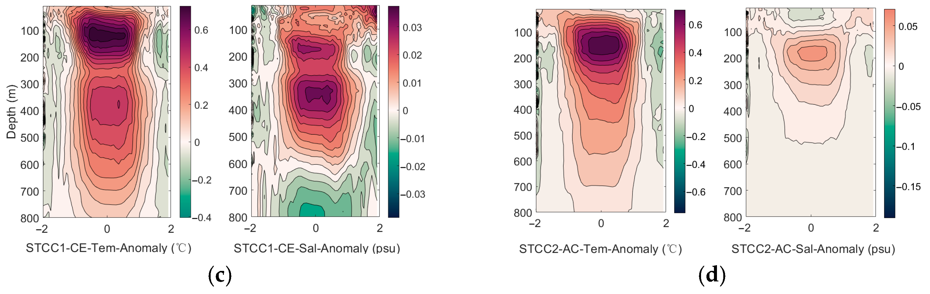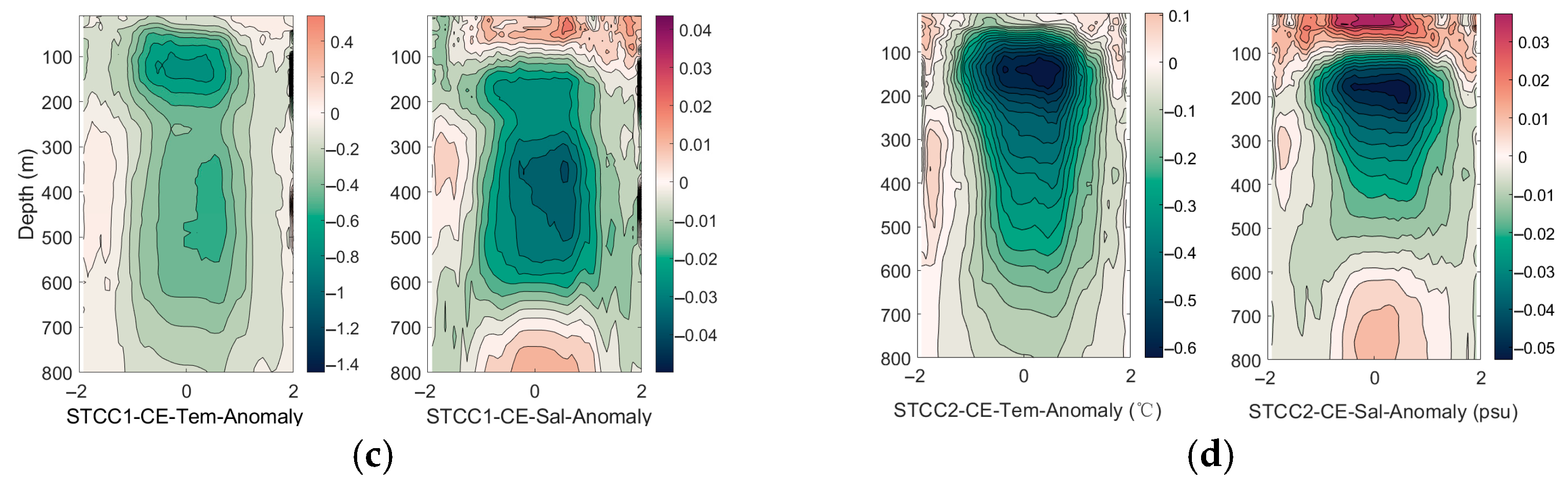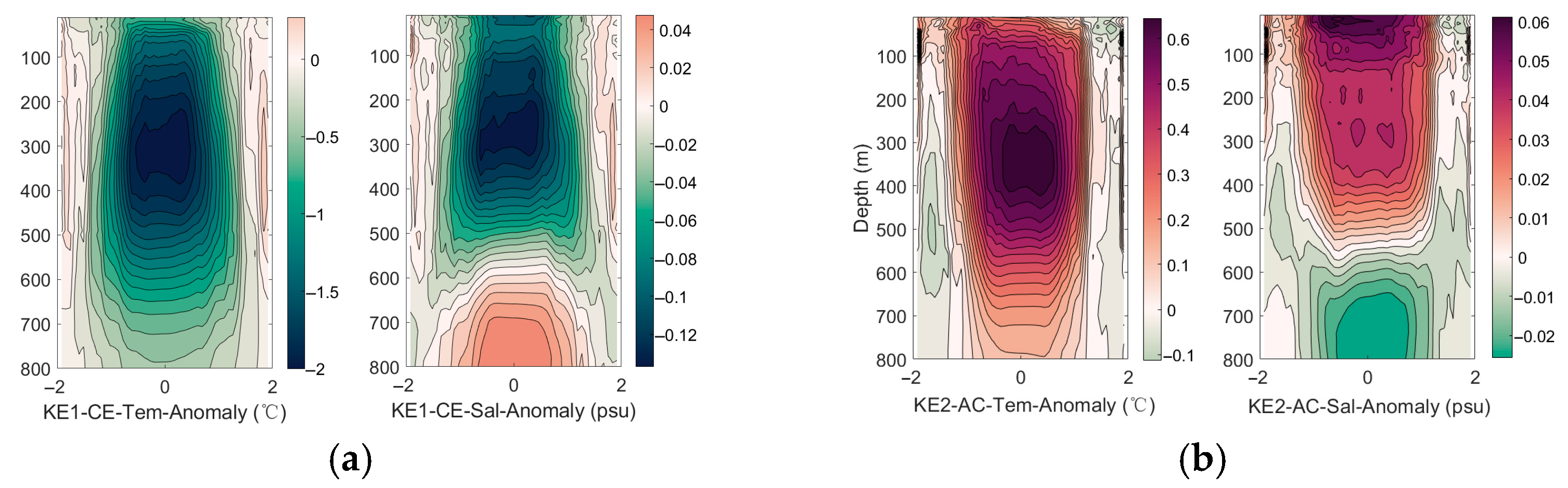 2.2. Composite Analysis of the Vertical Structure of Mesoscale Eddies