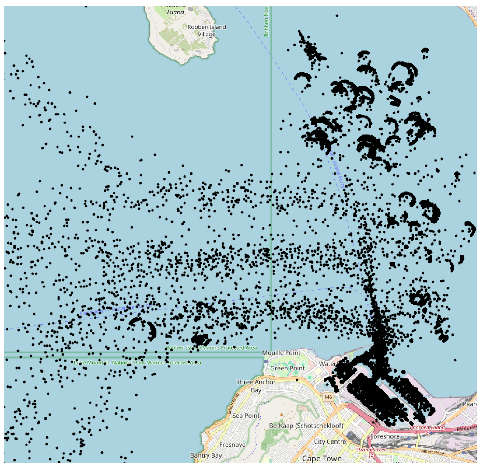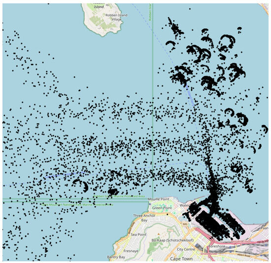 The AIS data utilized in this research were sourced using the Application Programming Interface (API) of AISStream.io, a platform that offers free access to terrestrial AIS data. Their network of AIS receiving stations, which varies in density globally, covers areas within approximately 200 km of the majority of the world’s coastlines. For a detailed visualization, a map of their AIS stations is available on their website. To receive AIS data from AISStream.io, one needs to define the region or regions of interest (ROIs) and, optionally, a list of vessels of interest based on Maritime Mobile Service Identities (MMSIs). The MMSI is a nine-digit number used for identifying vessels, ship stations, and coast stations in maritime communication and navigation systems. However, while an MMSI is linked to a single ship at a given time, it can be reassigned to different ships over time, and a ship might change its MMSI. Therefore, the MMSI is not a unique identifier, though it is used as an indicator for individual ships in this work. Finally, we do not utilize the vessel-specific filtering of the API. AIS data from the Cape Town and Limassol ports over a period of one month are shown in