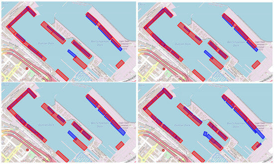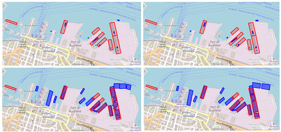 To localize port berths, the entire data set is used alongside the optimal hyperparameter configuration of both the GMM and DBScan. Moreover, during augmentation, we generate 20 points rather than 10. Finally, the hyperparameters of the GMM, “tolerance” and number of restarts, are set to and 5 respectively. To generate boundary boxes, the augmented AIS points that fall in each component of the final GMM (of each port) are encircled by a rotated rectangle, representing the area of the localized port berth. The rotated rectangle is calculated by finding the smallest possible rectangle that can contain all points in a cluster. To achieve this, we calculate the convex hull of the cluster points and then evaluate the bounding rectangles at different angles formed by the edges of the hull. The rectangle with the smallest area is selected as the final bounding box of each Gaussian component.