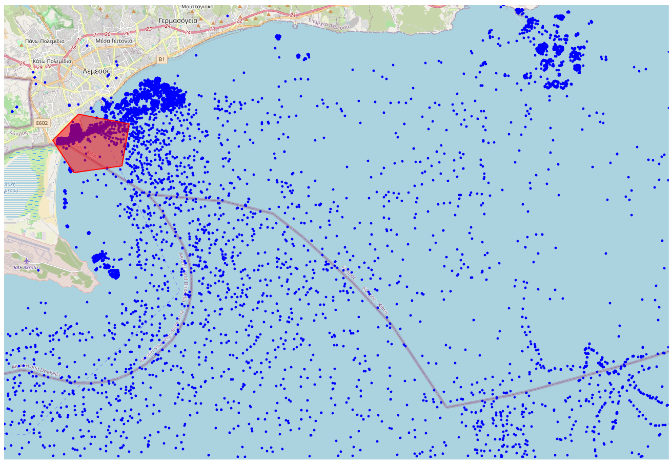 Figure 3, respectively. The port-specific ROI is an area covering an entire port while avoiding adjacent waterways or nearby ports. An example of the Limassol ROI compared to all the data collected for that port is shown in