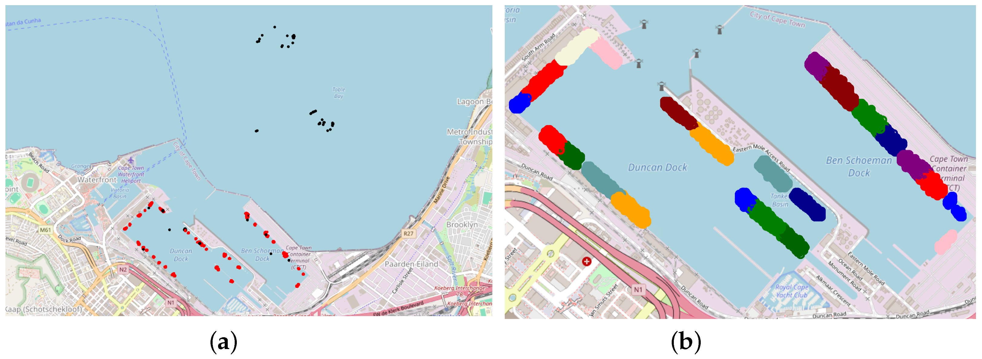 from one another. Note that haversine distance was used to account for differences in distances between points at different latitudes. DBSCAN effectively identifies and filters out outliers—in our case, these can be AIS messages with vessel movement or insufficient duration of stay. Such points are shown as black dots in