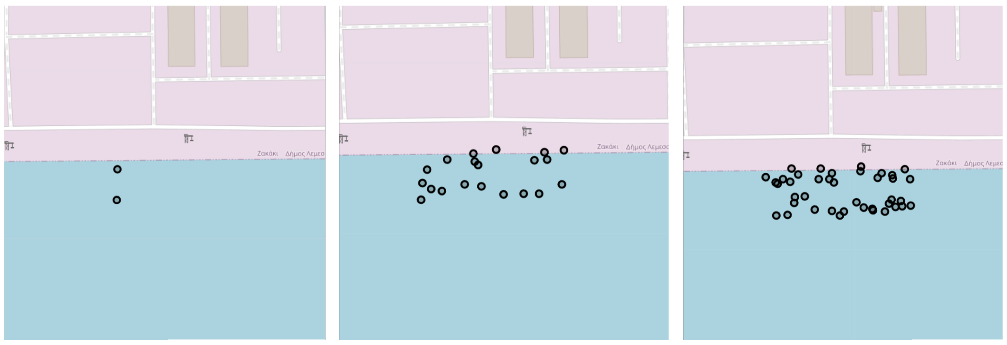 In the present work, DBSCAN is applied to each vessel independently, clustering AIS data points based on vessel movement (or lack thereof). Since the AIS data of each vessel are reported hourly, intuitively, the algorithm creates a cluster in locations where the vessel reportedly stayed for at least