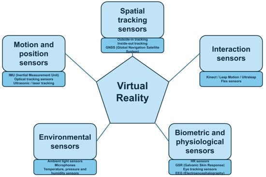 Experiences and real sensory perceptions evoke stronger emotional reactions (affective responses) compared to so-called substitute experiences, such as images or videos. However, it is not always possible to be physically present in a given environment and directly perceive environmental stimuli. In such cases, virtual reality proves extremely useful, as it induces directed behaviour of the organism through artificial sensory simulation. This effect can be achieved either through computer-generated environments or through pre-recorded and replayed videos [8]. Currently, VR designers create rich, computer-generated 3D environments that allow participants to perceive visual and auditory stimuli as if they were real. Head-mounted displays digitally track head movements in physical space, creating depth perception and rendering different images for each eye. Additionally, such displays isolate the user from the external world, producing the sensation of being immersed in a three-dimensional virtual environment [8,14]. VR technology functions in close conjunction with sensors (Figure 1), which possess a variety of functions and serve to enhance the user’s immersion in the virtual environment, thereby engendering the sensation of being transferred to an alternate reality. A variety of sensor technologies form the basis of functional VR systems, enabling real-time tracking, feedback and localisation in various engineering applications. These technologies include inertial measurement units (IMUs), physiological sensors (e.g., heart rate sensors) and GNSS modules. On the other hand, sensors provide data on human behaviour when using VR and human responses to various content presented in the virtual world. Consequently, sensors represent a valuable instrument in evaluating the effectiveness and relevance of content presented in VR.