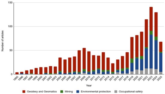 The source analysis was carried out based on predefined keywords (Table 1). As a result, a total of 3332 records were obtained. However, due to thematic inconsistency (e.g., not relating to the engineering areas discussed or incorrect meaning of keywords) or brief thematic mention in a significant number of publications, only those relevant to the subject of this article were selected. In total, 1395 records were retained. The analysis demonstrated a growing interest in VR, with scholarly attention to the use of virtual reality in the areas covered by this article beginning in 1995 (Figure 3). The increasing number of publications reflects the development and rising popularity of VR technology as well as its applications in various domains, including geodesy, mining, environmental protection, and occupational safety.