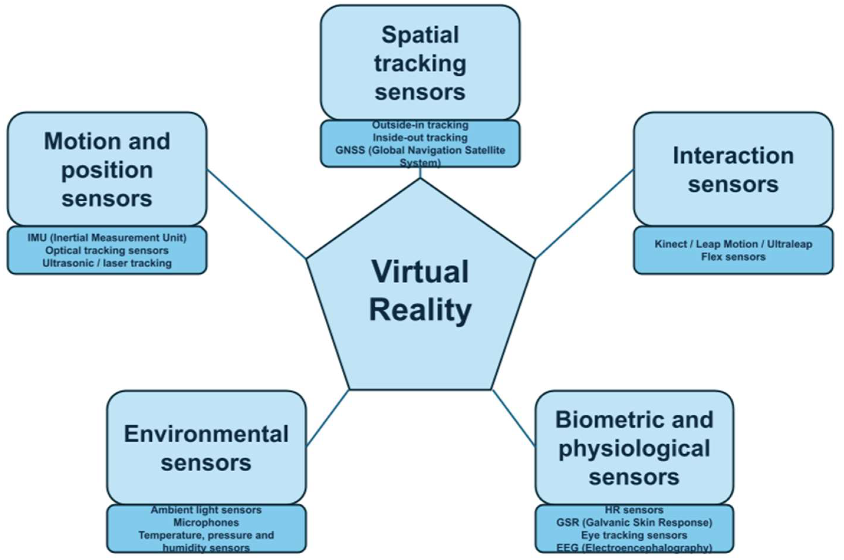 Experiences and real sensory perceptions evoke stronger emotional reactions (affective responses) compared to so-called substitute experiences, such as images or videos. However, it is not always possible to be physically present in a given environment and directly perceive environmental stimuli. In such cases, virtual reality proves extremely useful, as it induces directed behaviour of the organism through artificial sensory simulation. This effect can be achieved either through computer-generated environments or through pre-recorded and replayed videos [8]. Currently, VR designers create rich, computer-generated 3D environments that allow participants to perceive visual and auditory stimuli as if they were real. Head-mounted displays digitally track head movements in physical space, creating depth perception and rendering different images for each eye. Additionally, such displays isolate the user from the external world, producing the sensation of being immersed in a three-dimensional virtual environment [8,14]. VR technology functions in close conjunction with sensors (Figure 1), which possess a variety of functions and serve to enhance the user’s immersion in the virtual environment, thereby engendering the sensation of being transferred to an alternate reality. A variety of sensor technologies form the basis of functional VR systems, enabling real-time tracking, feedback and localisation in various engineering applications. These technologies include inertial measurement units (IMUs), physiological sensors (e.g., heart rate sensors) and GNSS modules. On the other hand, sensors provide data on human behaviour when using VR and human responses to various content presented in the virtual world. Consequently, sensors represent a valuable instrument in evaluating the effectiveness and relevance of content presented in VR.