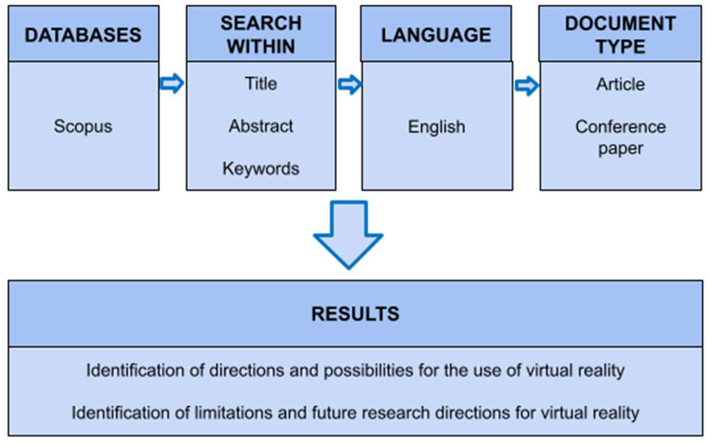 The Scopus database was searched for studies on the application of VR technology in the fields of mining, geodesy, environmental engineering, and occupational safety. The following criteria were applied: original articles or conference papers published in English in peer-reviewed journals, with no restrictions on the year of publication. The adopted methodology for conducting the literature review is presented in Figure 2.