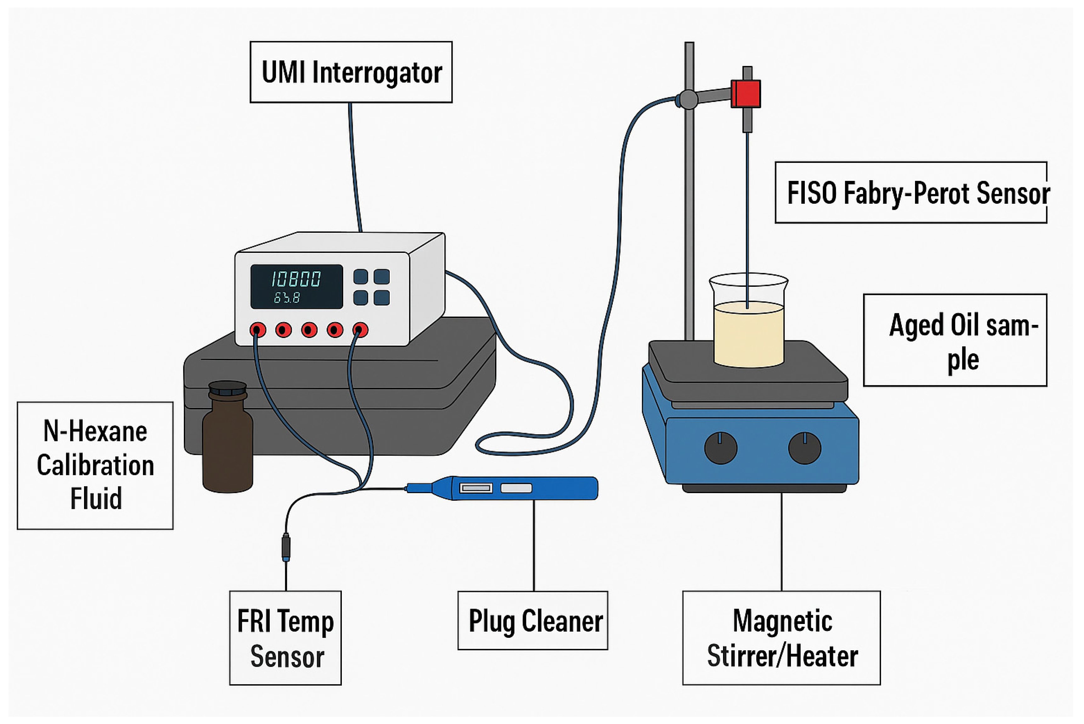 19]. This article presents an initial exploration of its use for industrial transformer oil applications, beginning with characterisation studies on four transformer oil samples. These studies focus on evaluating stability, repeatability, and temperature response, providing foundational insight into the sensor’s suitability for monitoring industrial oil systems.
