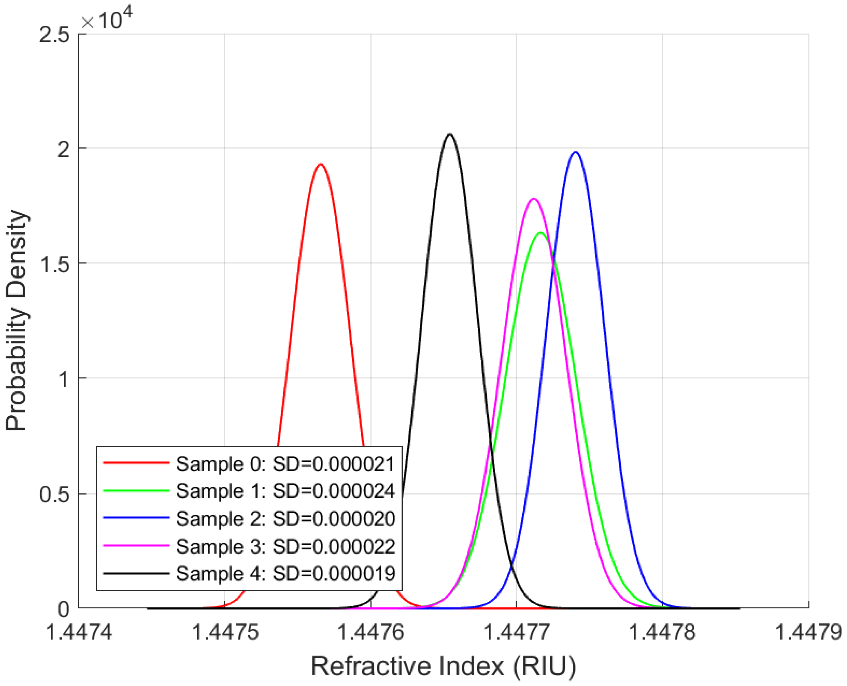 The FISO FRI refractive index sensor used in this work is a patented commercial device, and as such, some internal calibration and signal-processing parameters are not disclosed by the manufacturer (FISO–Resonetics) to end users. These include, for example, the detailed internal correlation algorithm used in the Fizeau wedge signal-processing module and specific optical cavity parameters embedded in the proprietary firmware of the Universal Multichannel Instrument (UMI). While these parameters are inaccessible, the authors have ensured that all experimentally measurable quantities, such as the refractive index range, resolution, operating wavelength, and temperature range, are reported (