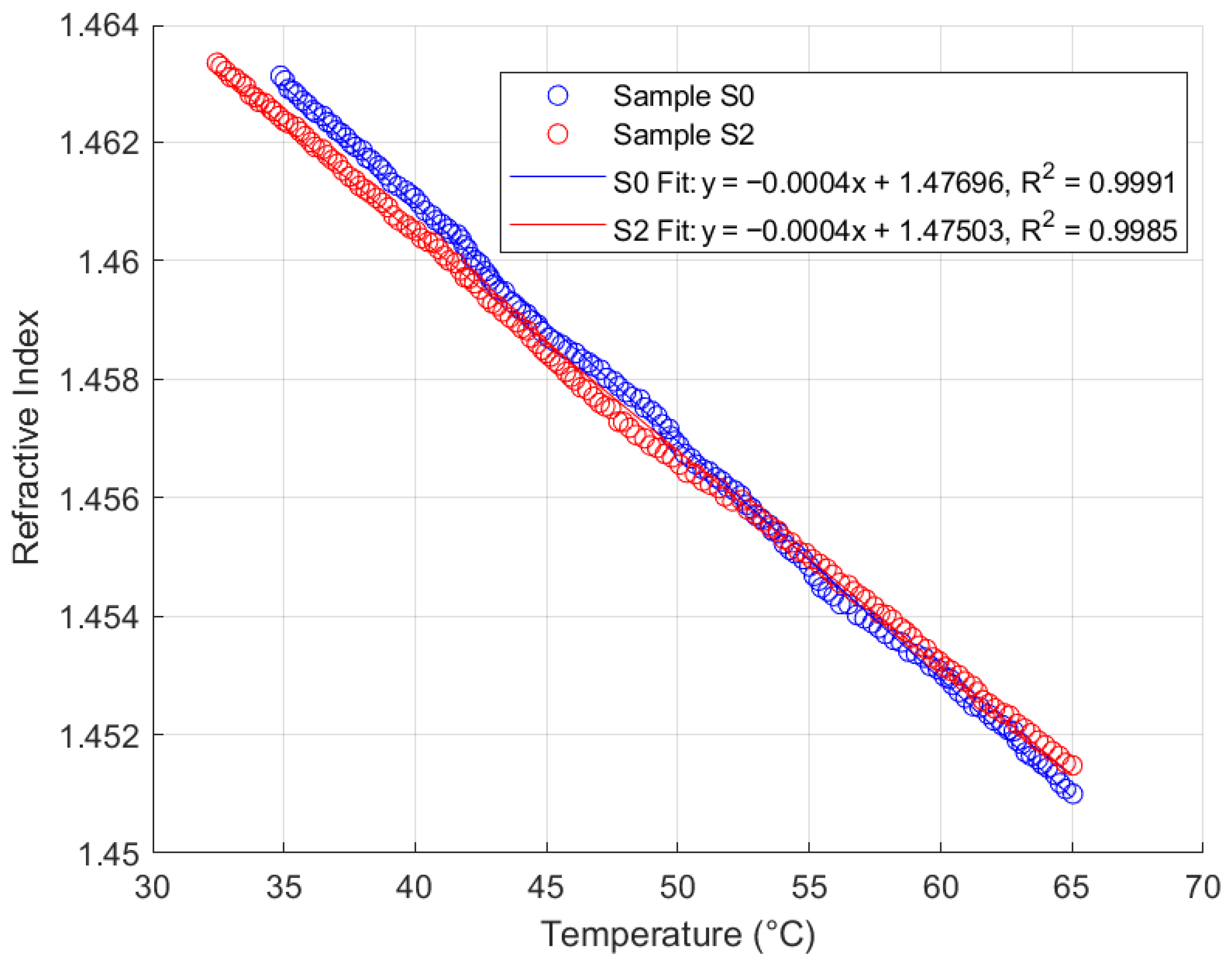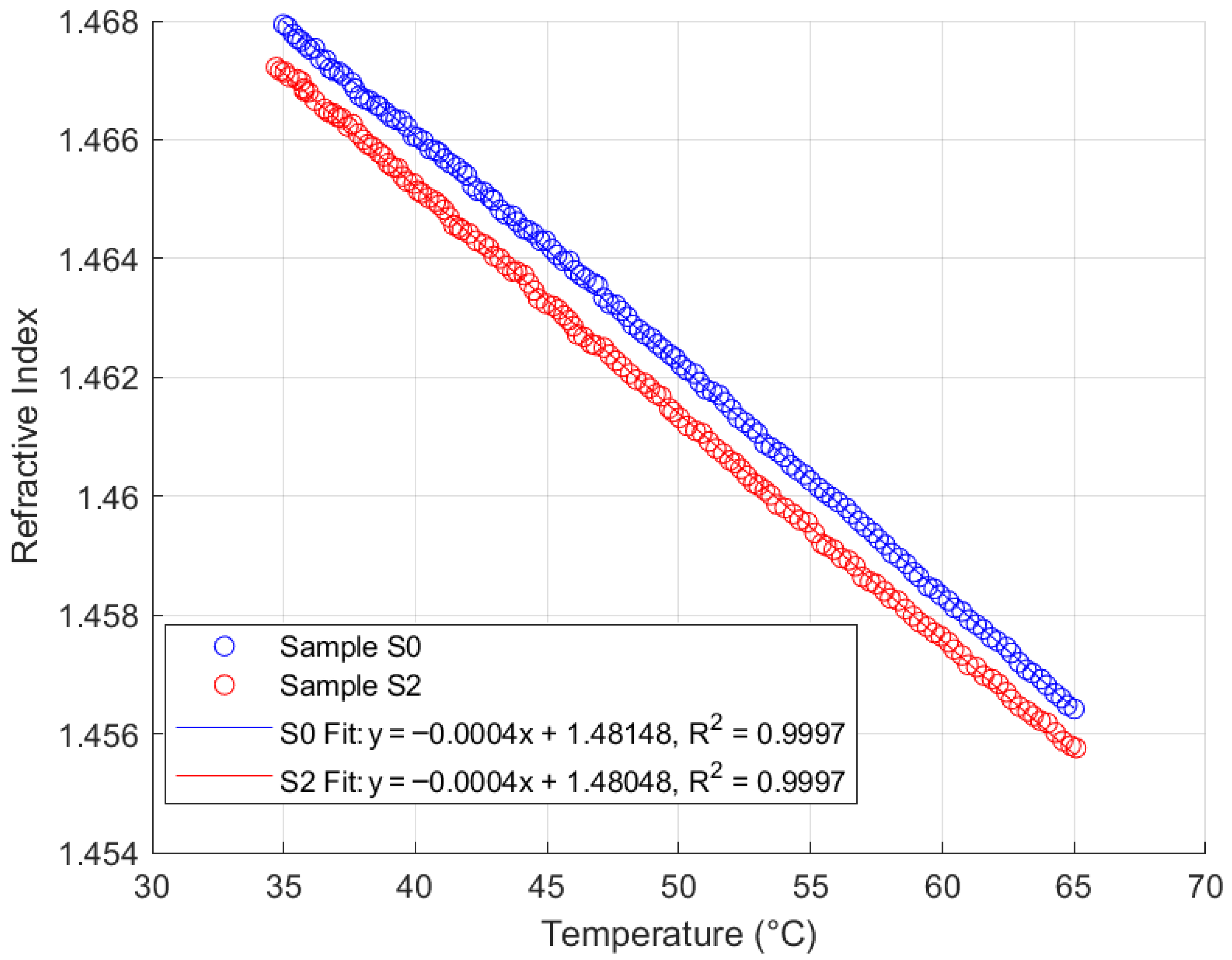 The study further revealed that, based on repeatability and thermal response analyses, natural ester oil and Nytro Bio 300X (a vegetable-based oil) yielded superior performance outcomes compared to synthetic ester oil and Polaris GX mineral oil. Specifically, the Fabry–Pérot sensor maintained a consistent thermal coefficient of approximately 0.0004 RIU/°C, with fitted linear plots exhibiting coefficients of determination exceeding 99% across all oil types. In contrast, the synthetic ester and mineral oils demonstrated greater sensitivity to temperature-induced RI changes, leading to increased measurement variability and lower consistency in thermal analysis plots.