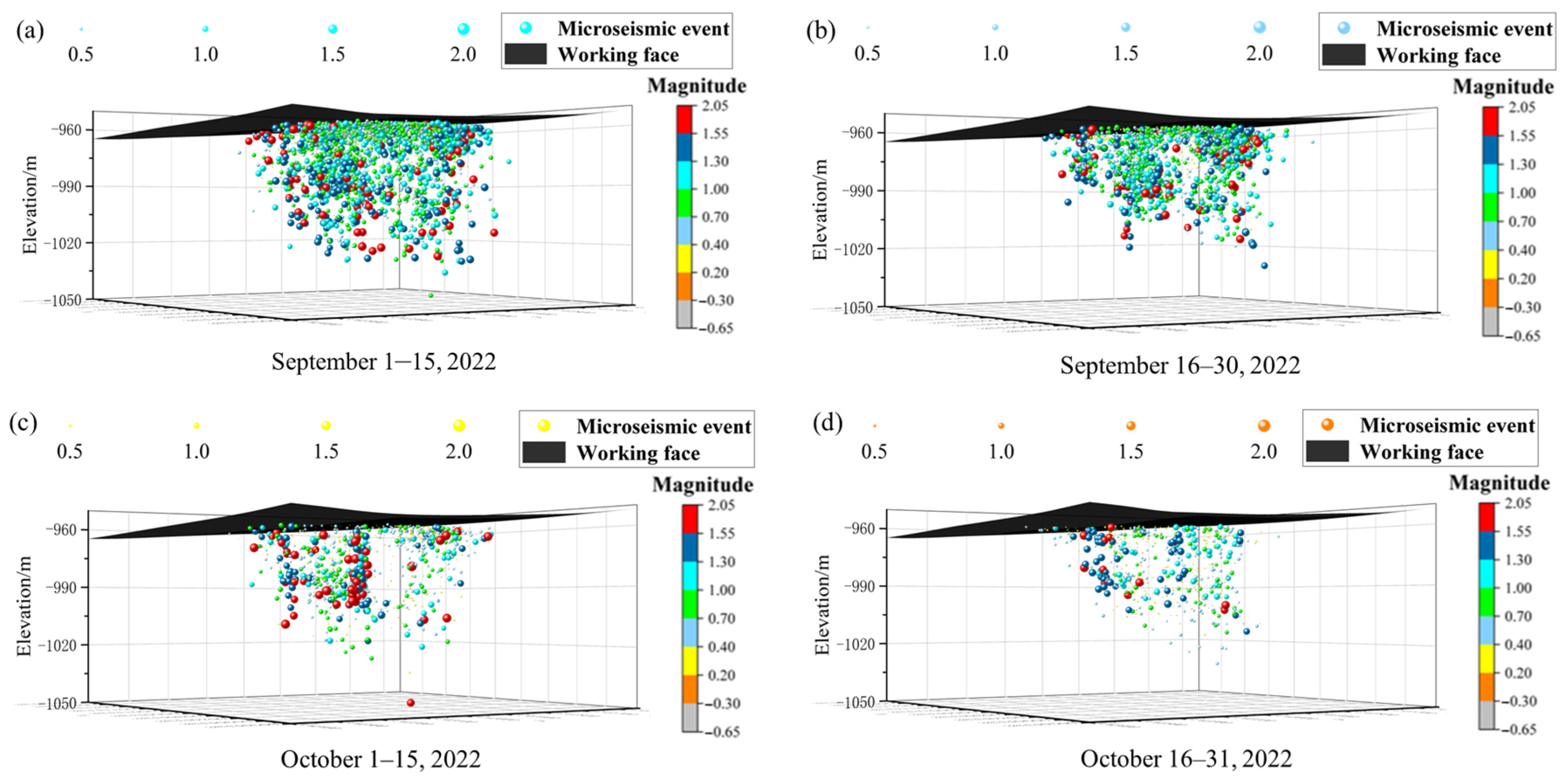 - Among the MS events recorded in the floor of the F.17-33200 working face, a total of 5456 events had magnitudes less than 1.30, accounting for 89.27% of all events. The frequency of MS events decreases vertically with increasing depth, with fracture events mainly concentrated within 0–40 m of the floor, and the deepest occurrence reaching 84.78 m.