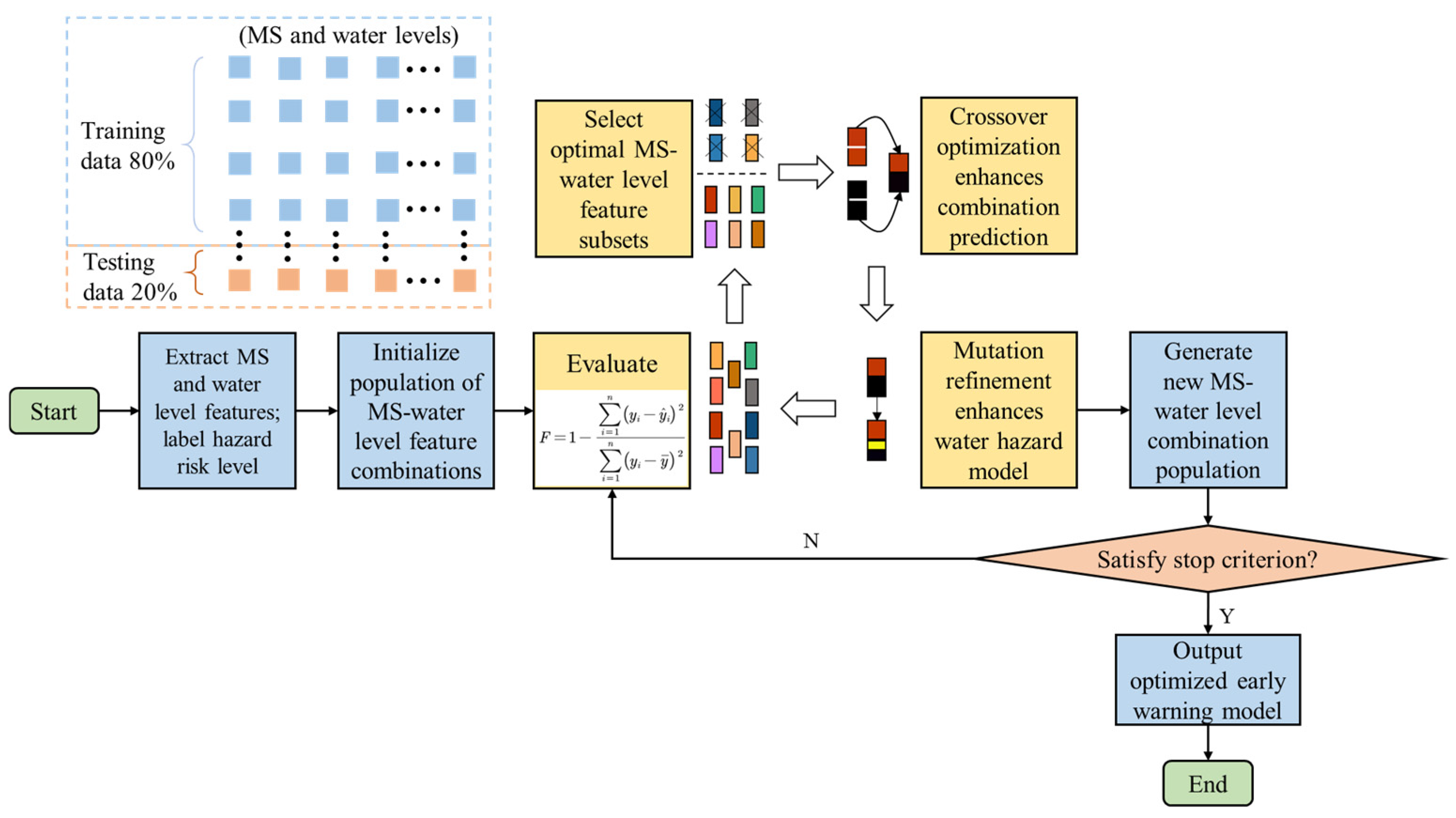 - Indicator optimization and weight distribution: GA is used for global optimization of multi-source feature combinations to select the optimal indicator set. The integration of AHP and RF models is used to assign weights to indicators through a combination of subjective and objective methods.
