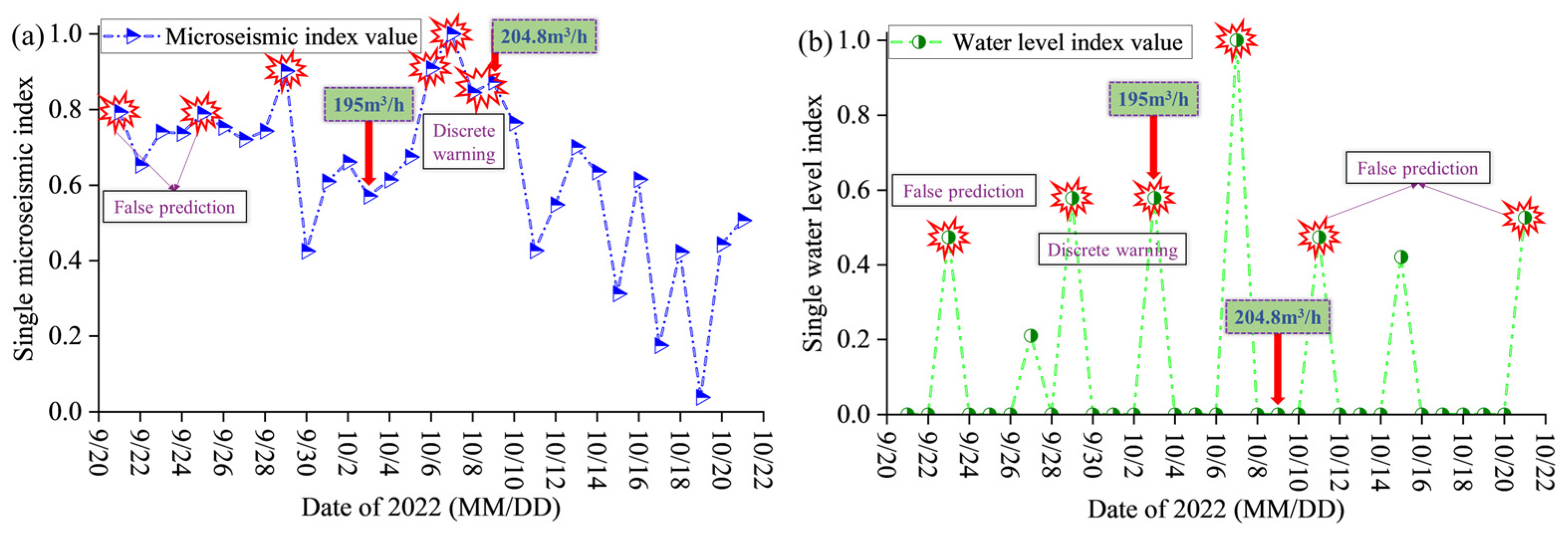 - Analysis of field monitoring data shows that significant sensitivity response characteristics exist prior to floor water inrush: single high-energy events and high daily cumulative energy of MS activity are found to be strongly correlated with water level decline. Based on this, a method that combines MS energy with water level dynamics is proposed, by which effective early warning of floor water inrush disasters can be achieved.
