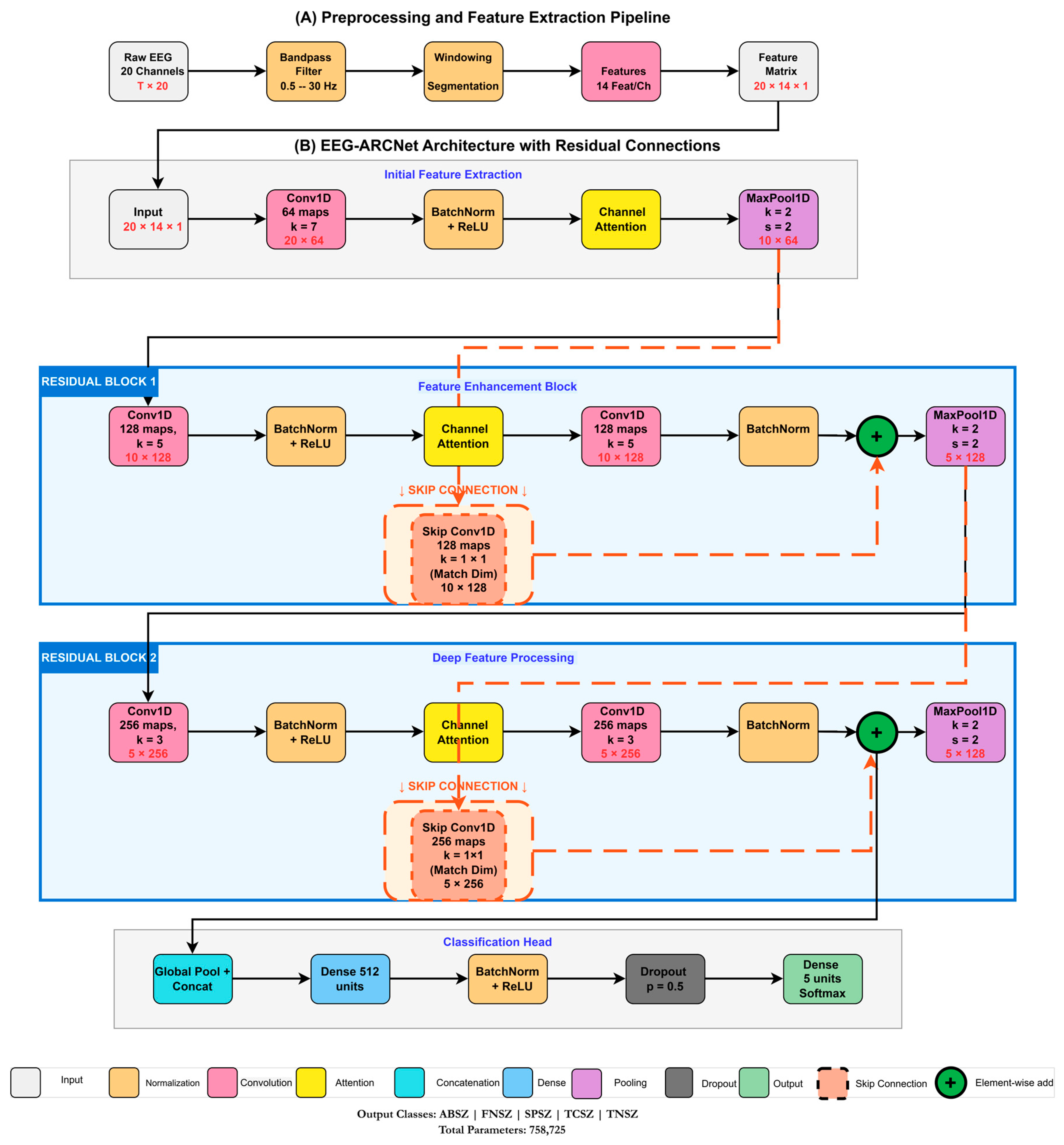 The complete network contains 758,725 trainable parameters distributed across convolutional layers, attention modules, and the classification head. This compact architecture maintains sufficient capacity for learning discriminative seizure features while remaining deployable on resource-constrained devices.