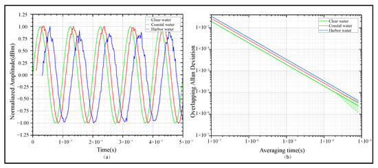 The influence of Mie scattering in different water bodies on frequency signal quality at a frequency of 1 MHz. (a) Signals across different water bodies. (b) Allan deviation of received signals across different water bodies.