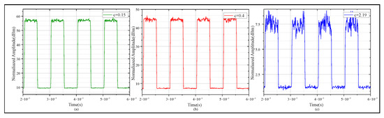 Furthermore, when simulating square wave propagation in water environments with different extinction coefficients, a typical time signal (10 MHz) was selected to analyze the influence of different attenuation and scattering characteristics on the signal’s time-domain properties; the results are shown in Figure 8. Figure 8a–c show the receiving 10 MHz square wave signals when the extinction coefficients are 0.15, 0.4, and 2.19, respectively.
