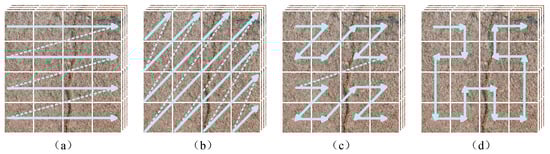 In recent years, two-dimensional scanning strategies have demonstrated strong feature-modeling capability in image analysis tasks. However, common scanning modes in visual Mamba models include parallel, diagonal, Z-order, and Hilbert scans [,]. Each mode follows a single strategy (Figure 2). Parallel scans better capture long-range dependencies along the horizontal and vertical directions; diagonal and Z-order scans are more suitable for modeling global information along diagonal paths; and Hilbert scans preserve spatial continuity to some extent but are weaker in capturing global information. Thus, single-strategy modes are limited when handling complex structures and cannot fully represent slender, irregular cracks across multiple directions [].