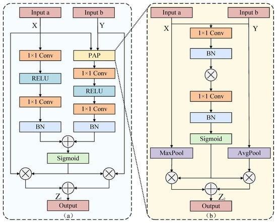 As shown in Figure 4a, DBPGL fuses two inputs using a dual-branch structure, focusing on local detail preservation and global texture completion. In the left branch, the input feature passes through a 1 × 1 convolution for channel reduction, which is followed by ReLU to introduce nonlinearity and enhance representation. A 1 × 1 convolution then restores the original channel number. Batch normalization is applied to improve training stability and generalization. The right branch employs PAP to complement global structural information related to crack continuity. Finally, the outputs of the two branches are fused. Element-wise operations compute per channel attention weights via a sigmoid function, which enables adaptive importance assignment to the two branches. The fusion can be written as the equations below.