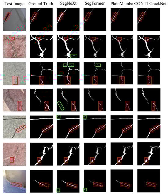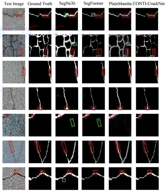 The visual results in Figure 7 also show clear advantages. In scenes with complex backgrounds and strong texture noise, CNN and Transformer models such as SegNeXt and SegFormer often produce false positives or fake cracks, as seen in the first and fifth rows of Figure 7. When crack shapes are complex, Mamba methods can still show over segmentation or blurry boundaries, as illustrated in the second row. In contrast, CONTI-CrackNet accurately extracts the main crack skeleton in most cases and maintains sharp edges and global continuity; even under high noise or low contrast, it avoids several false segmentations. Although CONTI-CrackNet does not perfectly recover every tiny crack, its results are closer to the ground truth and contain much less noise overall.