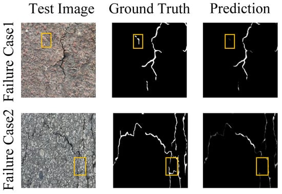 To objectively evaluate the performance of CONTI-CrackNet, we analyze the failure cases observed in our experiments. Figure 8 illustrates two representative scenarios: extreme noisy backgrounds and complex crack intersections. Experiments indicate that in complex scenarios with strong noise and frequent crack intersections, the continuity of fine cracks remains disturbed. Fine cracks may not be fully recovered because complex backgrounds cause confusion between crack pixels and background textures, and intricate crack geometries tend to induce discontinuities at intersections. Although CONTI-CrackNet may exhibit under-segmentation in a few extreme cases, the proposed architecture improves segmentation accuracy under challenging conditions. In future work, we will further enhance the model to increase noise robustness and multi-scale handling, thereby improving the overall performance.