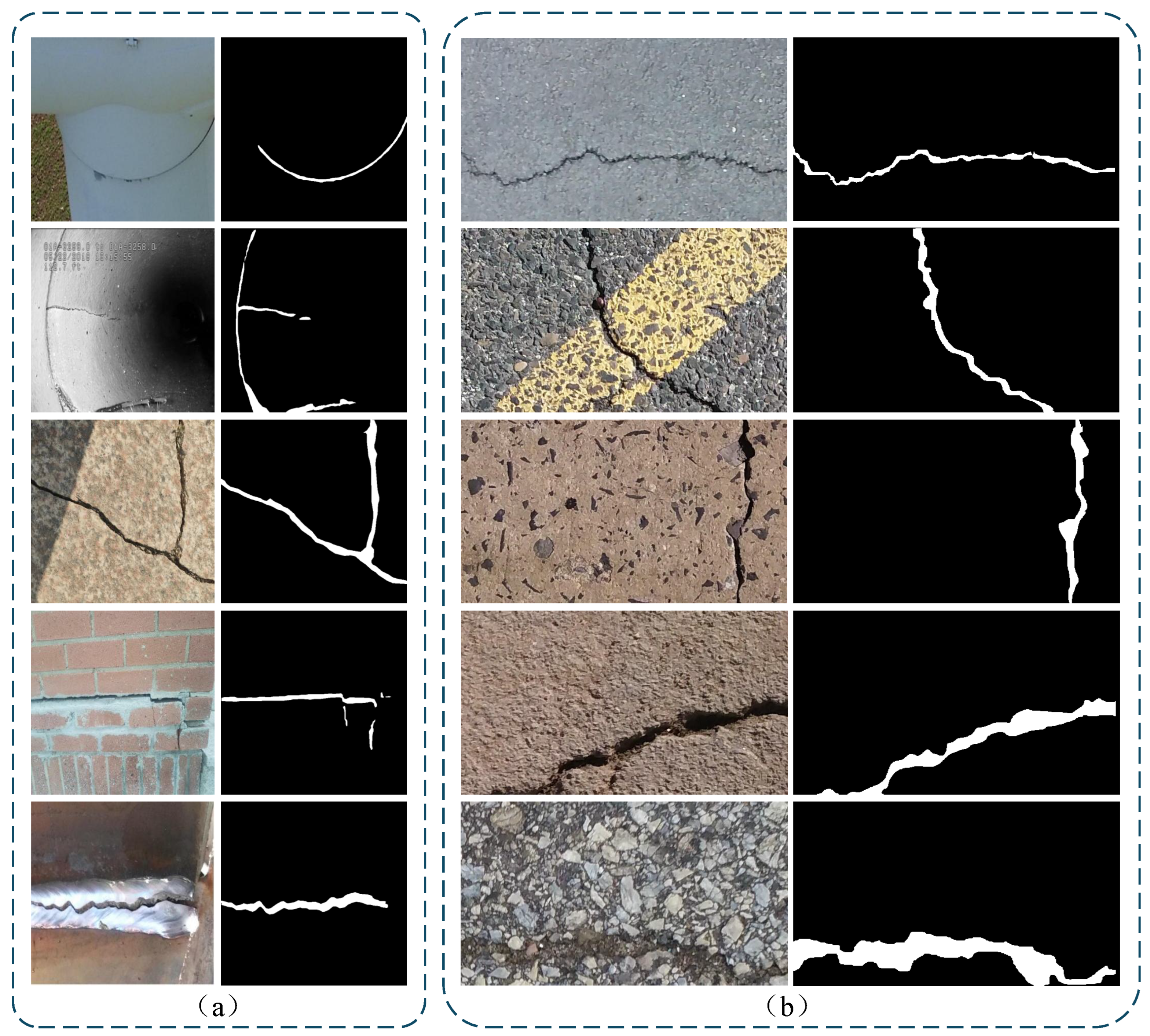 - TUT [42]: Unlike datasets with simple backgrounds, TUT contains dense and cluttered scenes with diverse crack shapes. It includes 1408 RGB images from eight representative scenes: bitumen, cement, bricks, runways, tiles, metal, generator blades, and underground pipelines. Of these, 1270 images were collected in-house using mobile phones, and 138 images were sourced from the internet.