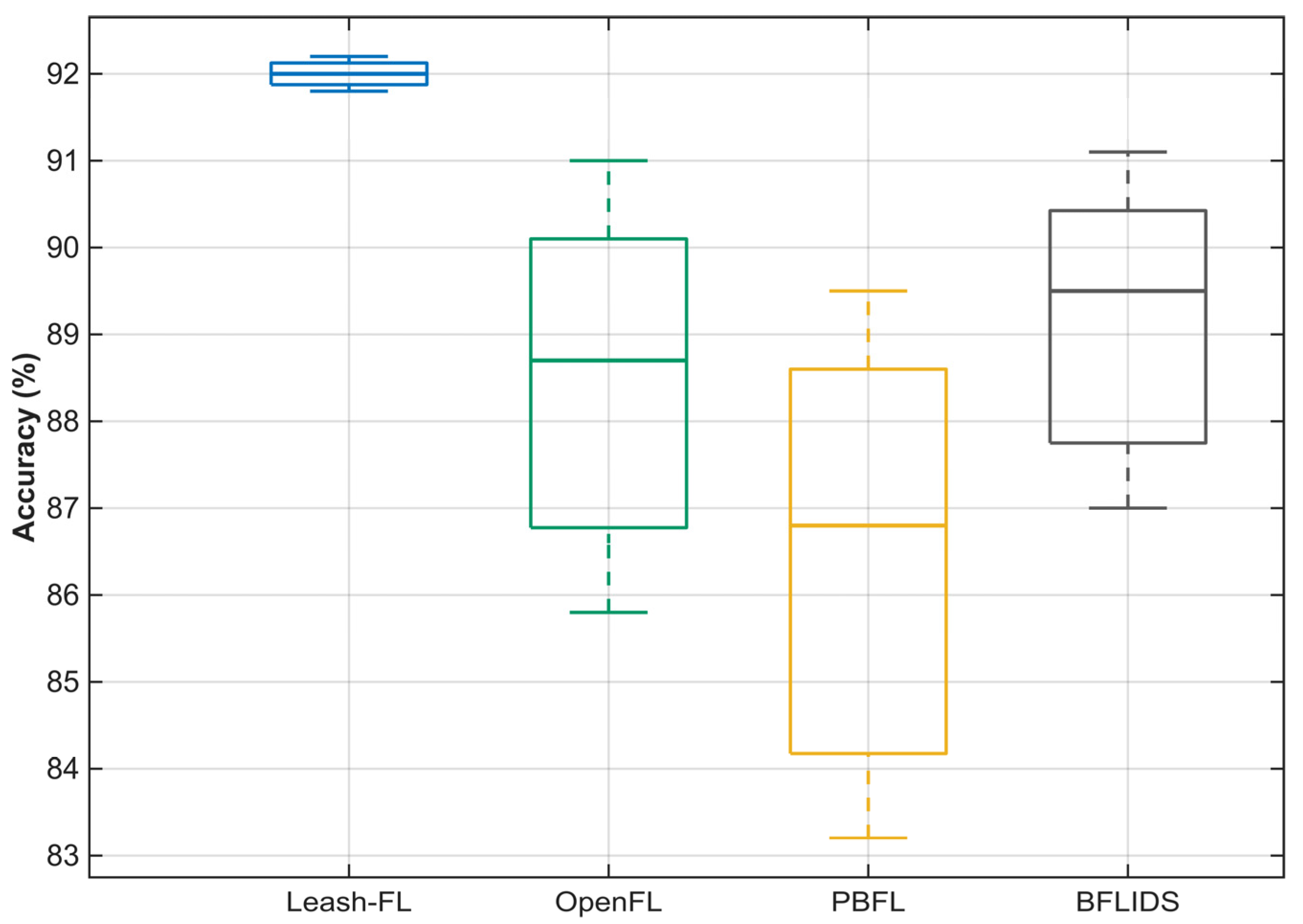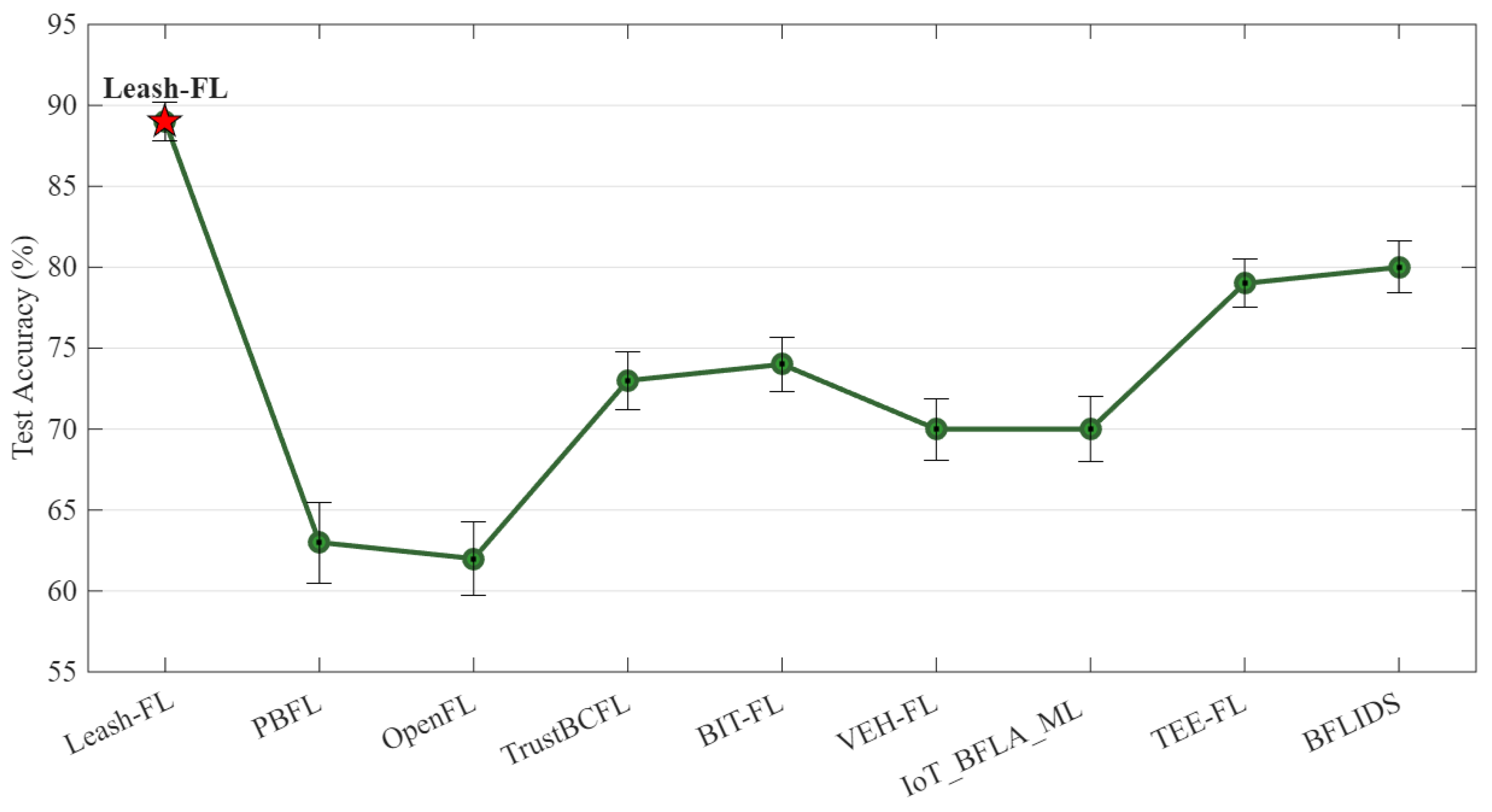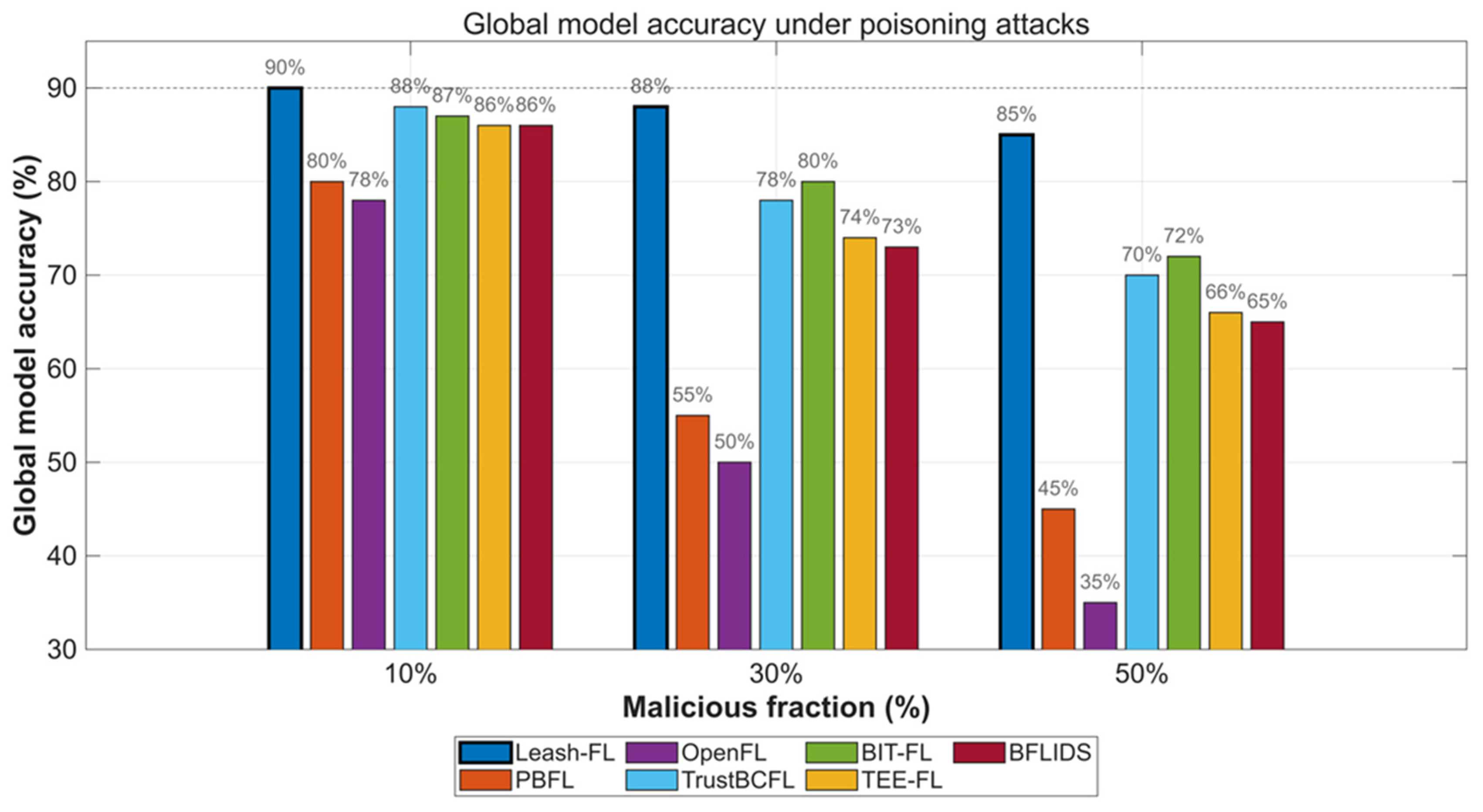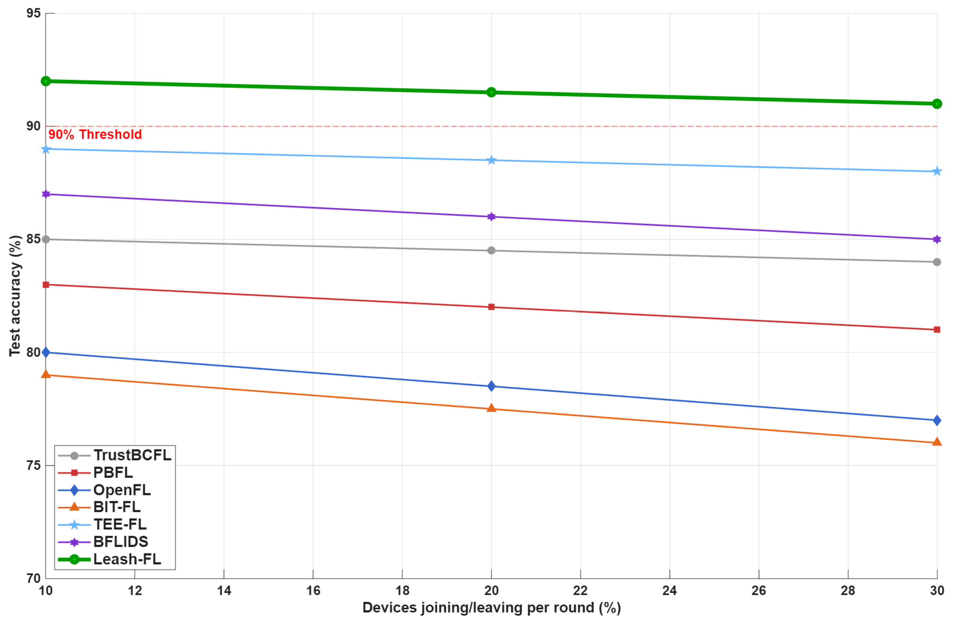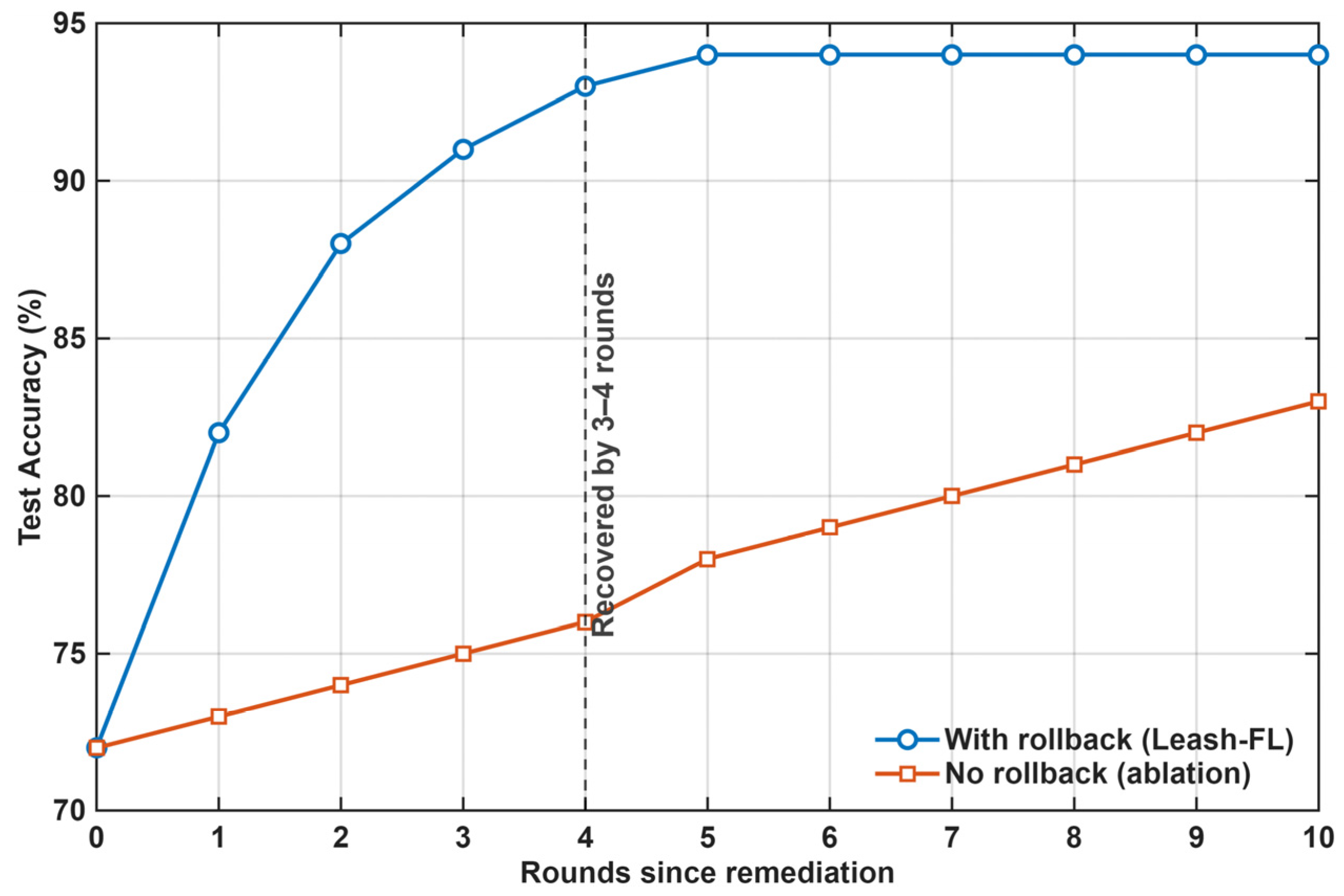 In summary, Leash-FL provides a complete end-to-end framework for secure and resilient federated learning in IoT environments. It begins with certificateless credential initialization, followed by authenticated local training, edge-side verification, and blockchain-audited screening. Weighted aggregation, checkpointing, and self-healing preserve integrity and enable adaptive recovery from anomalies, while authenticated redistribution ensures model consistency across devices. Finally, CRT-based rekeying and blockchain-backed membership management maintain forward and backward secrecy during join, leave, and re-admission events. Collectively, these components enable scalable, trustworthy, and verifiable learning across heterogeneous IoT systems.