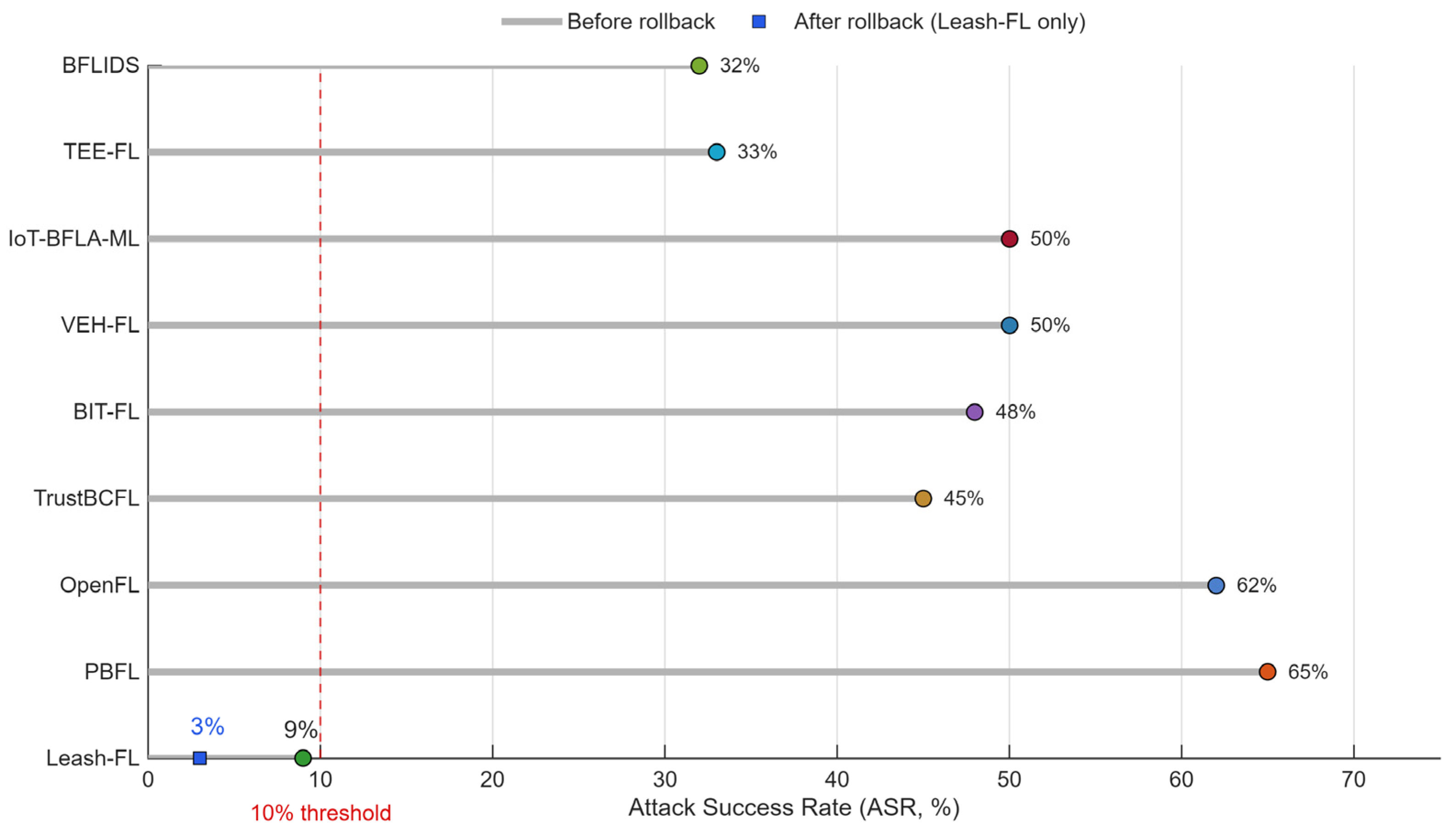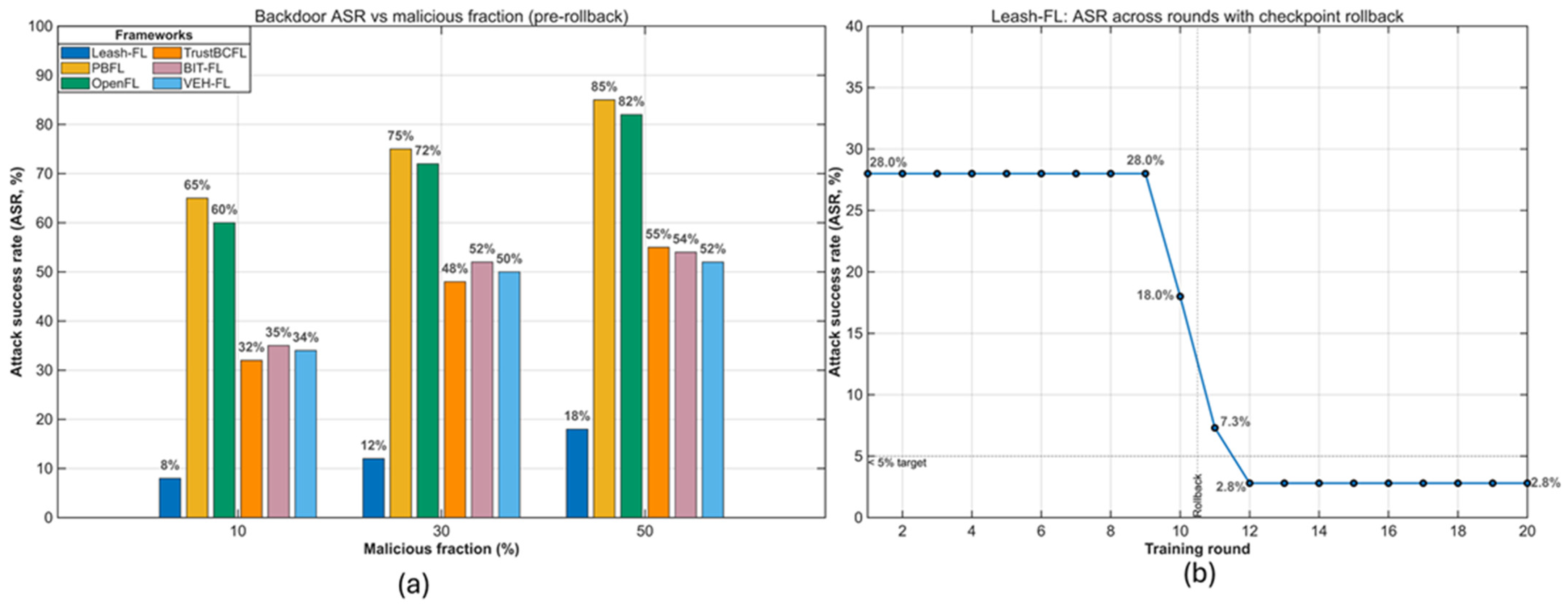Each self-healing event, rollback, pseudonym refresh, key rotation, or threshold update, is immutably recorded on the blockchain ledger, providing traceability without exposing model parameters. Through this synergy of weighted aggregation, anomaly detection, and checkpoint-based recovery, Leash-FL remains resilient to poisoning, Sybil, and free-rider attacks. At the same time, blockchain-anchored logging ensures that every recovery action is auditable and tamper-evident, preserving the trustworthiness of federated learning across all participants.