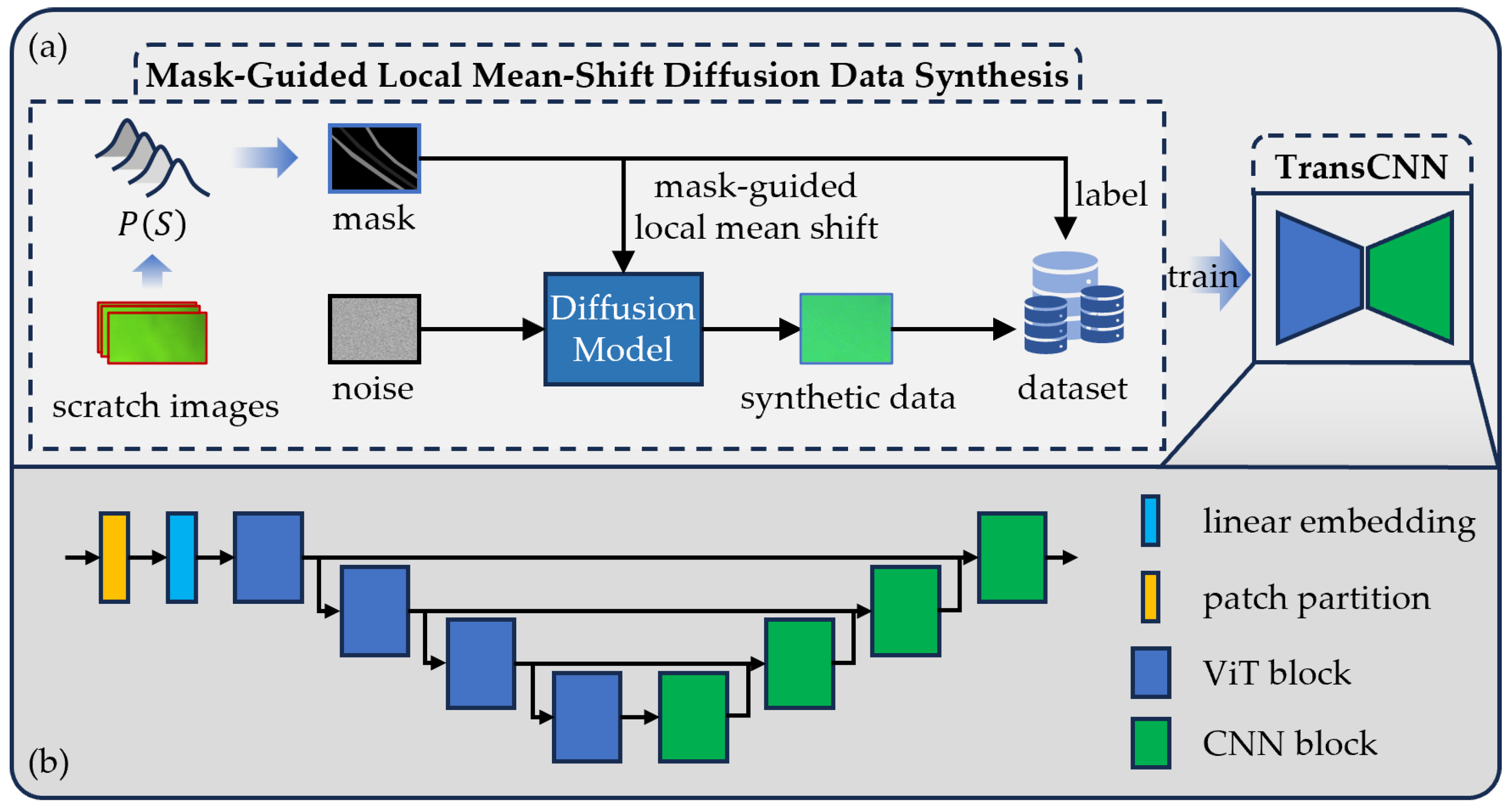 We propose the SCRS: The first part employs the MSDS to generate a training dataset for scratch segmentation, while the second part trains TransCNN for scratch segmentation. The diffusion model in MSDS is trained using normal data. The effectiveness of MSDS is assessed through segmentation performance. Similarly, TransCNN is trained on the MSDS-generated dataset, and its effectiveness is evaluated using segmentation results of real-world scratches. To validate the SCRS framework, we utilize chip images collected from a production line to construct the MSDS training set and the TransCNN test set.