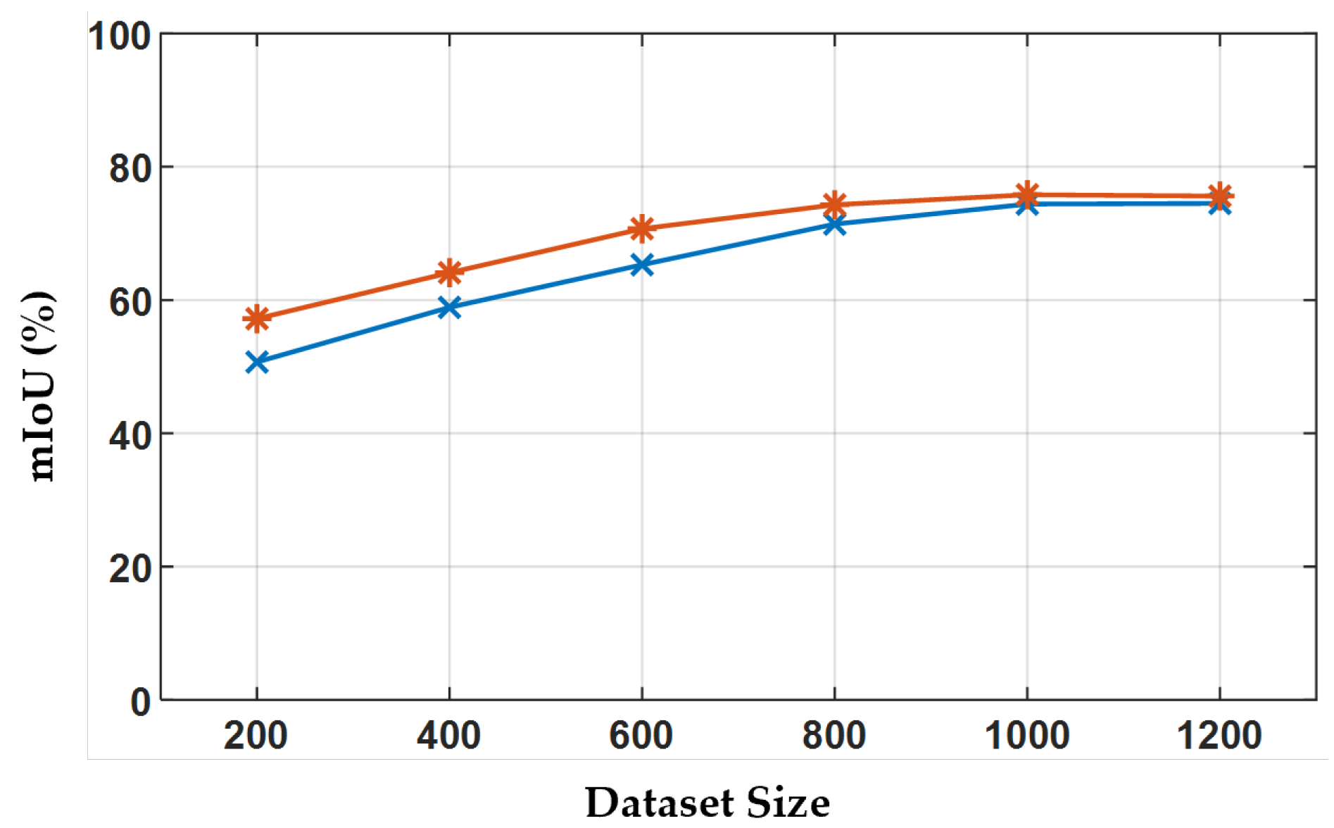 Figure 4. The segmentation accuracy for deep and shallow scratches enhances with larger datasets, but this effect plateaus beyond a size of 800. Consequently, we adopted a dataset size of