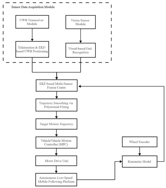 Enhancing the positioning stability and accuracy of autonomous following systems poses a significant challenge, particularly in dynamic indoor environments susceptible to occlusion and interference. This paper proposes an innovative approach that integrates Ultra-Wideband (UWB) technology with computer vision-based gait analysis to overcome these limitations. First, a low-power, high-update-rate UWB positioning network is established based on an optimized Double-Sided Two-Way Ranging (DS-TWR) protocol. To compensate for UWB’s deficiencies under Non-Line-of-Sight (NLOS) conditions, a visual gait recognition process utilizing the GaitPart framework is introduced for target identification and relative motion estimation. Subsequently, an Extended Kalman Filter (EKF) is developed to seamlessly fuse absolute UWB measurements with gait-based relative kinematic information, thereby generating precise and robust estimates of the leader’s trajectory. This estimated path is tracked by a differentially driven mobile platform via a Model Predictive Controller (MPC). Experimental results demonstrate that the tracking deviation for most trajectory points remains within 50 mm, with a maximum observed deviation of 115 mm during turns, confirming its strong robustness and practical utility in real-world intelligent vehicle applications.