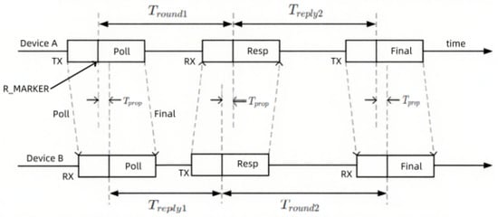 Accurate ranging serves as the foundation of UWB positioning. This study employs a ranging method based on Time of Flight (ToF), specifically the Double-Sided Two-Way Ranging (DS-TWR) protocol. This method achieves high-precision distance measurement without requiring strict clock synchronization by utilizing multiple signal exchanges. Its fundamental principle [] is illustrated in Figure 2.