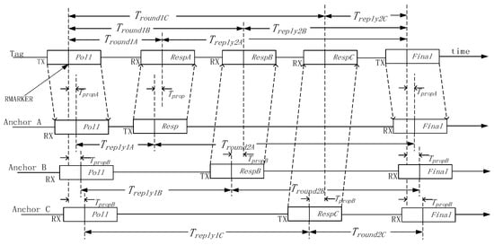 This time can be calculated using its measured values and and transmitted back by the tag via the Final message. The same principle applies to Base Stations B and C.