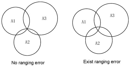 To acquire the two-dimensional position coordinates of the navigator, the classic trilateration method [] is used to calculate the initial coordinates of the tag. This method is straightforward and effective, helping to mitigate the impact of random errors. Ideally, the three circles should intersect at a single point. However, due to ranging errors, an overlapping region typically forms (as shown in Figure 4). To address this, this paper employs the centroid method to determine the final position: the points a, b, and c, formed by the pairwise intersections of the three circles, constitute a triangle, and their centroid is taken as the positioning result (Figure 5). The calculation formula is as follows: