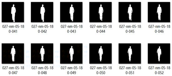 After the target is detected, the human silhouette is extracted based on the background subtraction method []. Following threshold segmentation and morphological closing operations, batch normalization is applied. The centroid is calculated and used as the central axis to standardize the contour image into a target silhouette map of size 64 × 44 pixels (Figure 7).