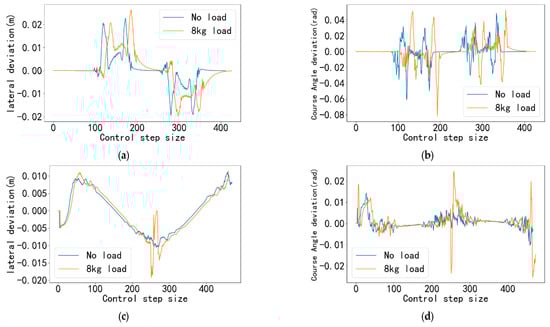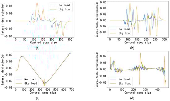 Under no-load conditions (Figure 21), the system maintains tracking errors within 50 mm during straight-line segments, demonstrating excellent tracking accuracy. The maximum deviation (115 mm) occurs during turns, which is attributed to the transient response delay of the MPC when adjusting differential speeds under abrupt curvature variations. Nevertheless, the controller demonstrates rapid convergence, indicating effective dynamic regulation capability.