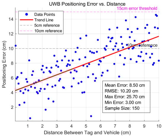 The overall error statistics are summarized in Table 11, while the positioning error as a function of the tag-vehicle distance is shown in Figure 17.